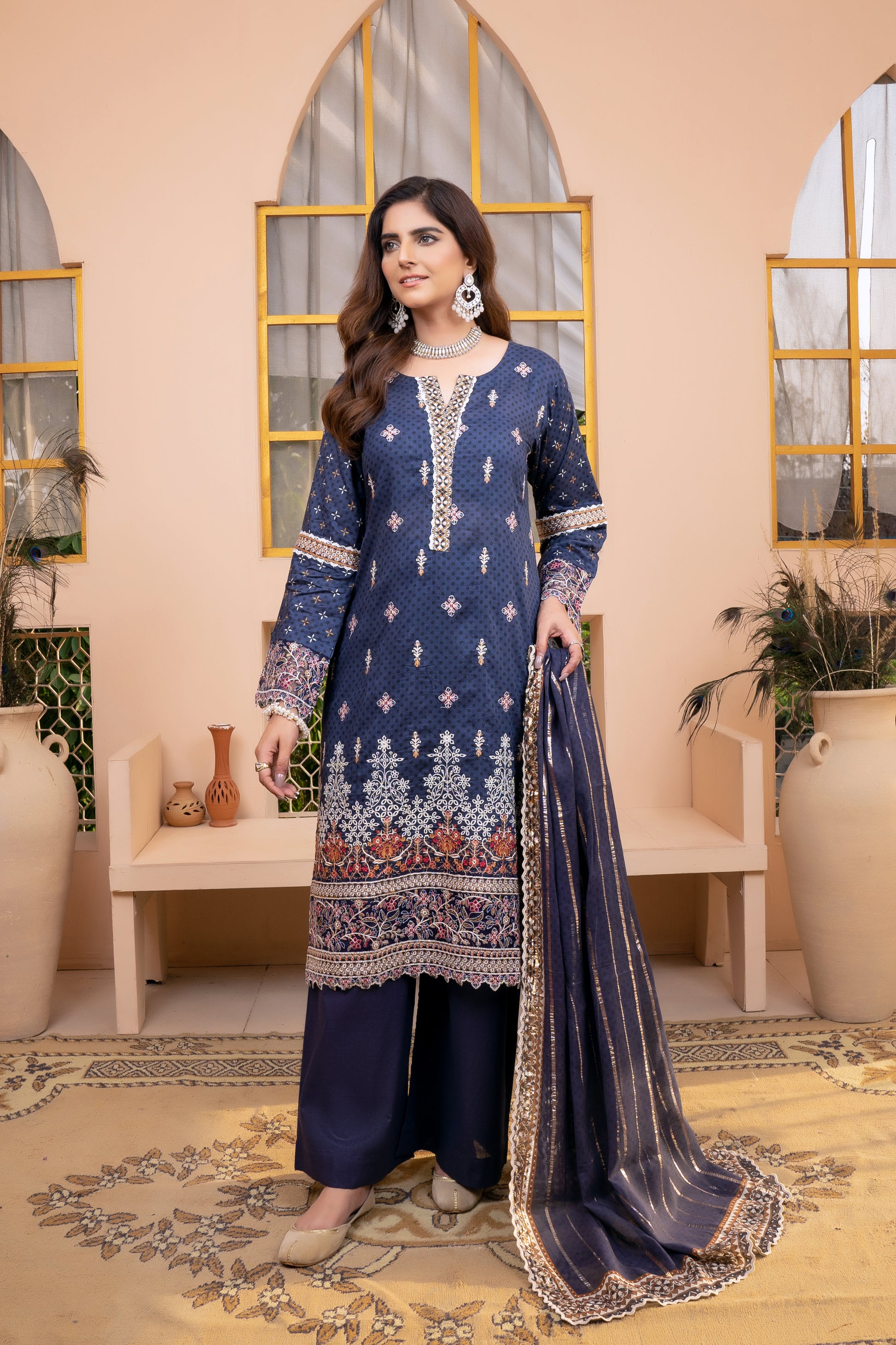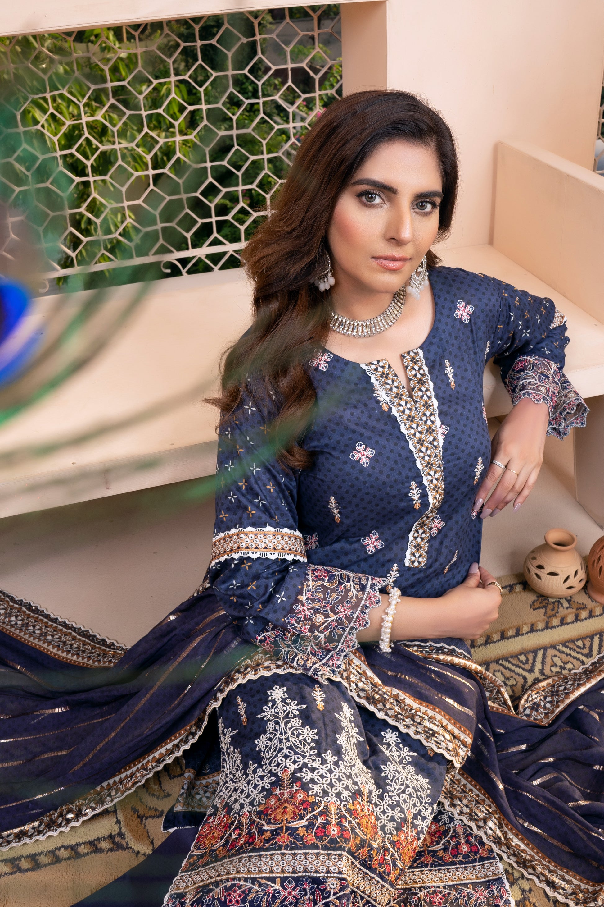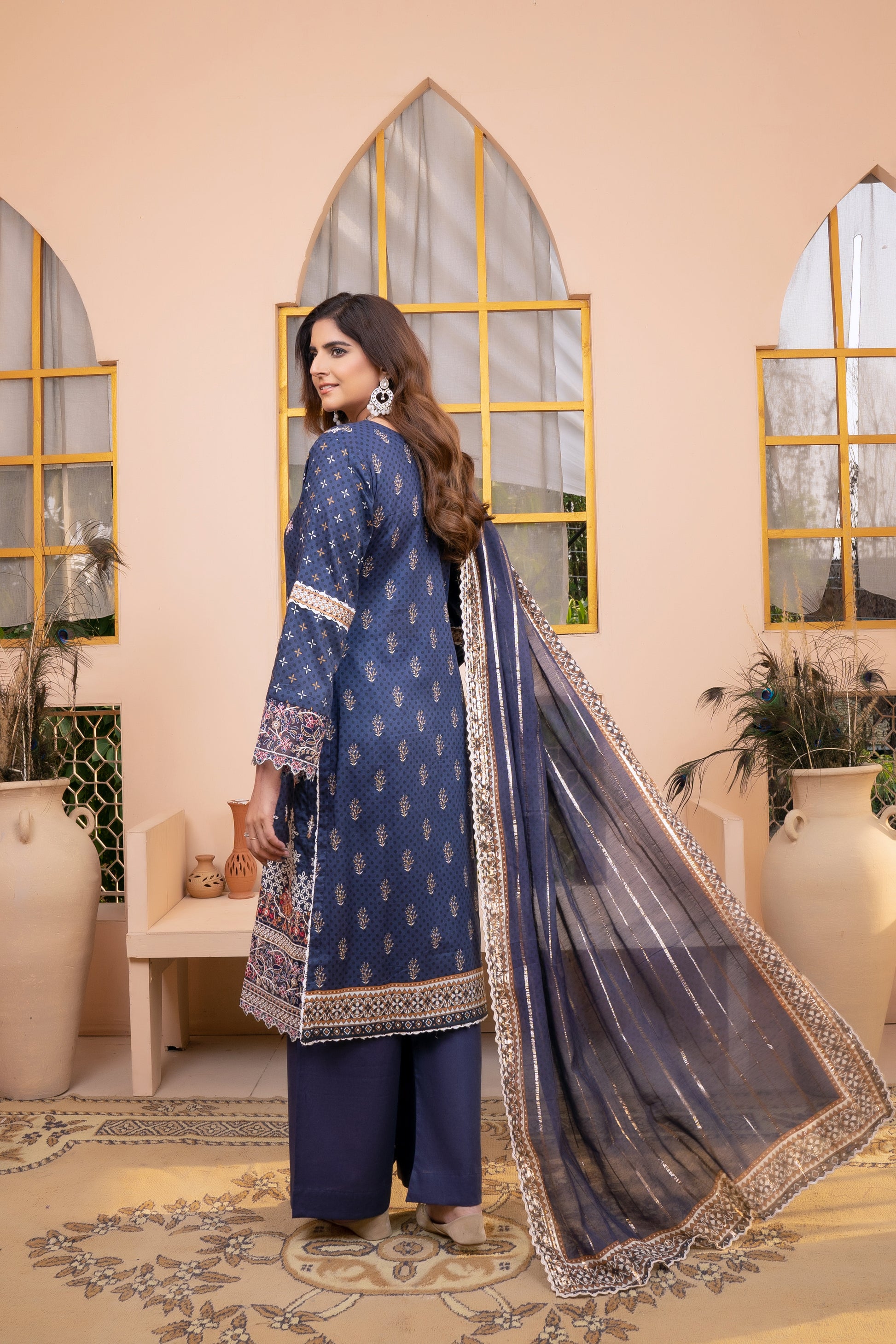 (Blue) 3Pc Printed Embroidered Lawn Dress by MUNIRA