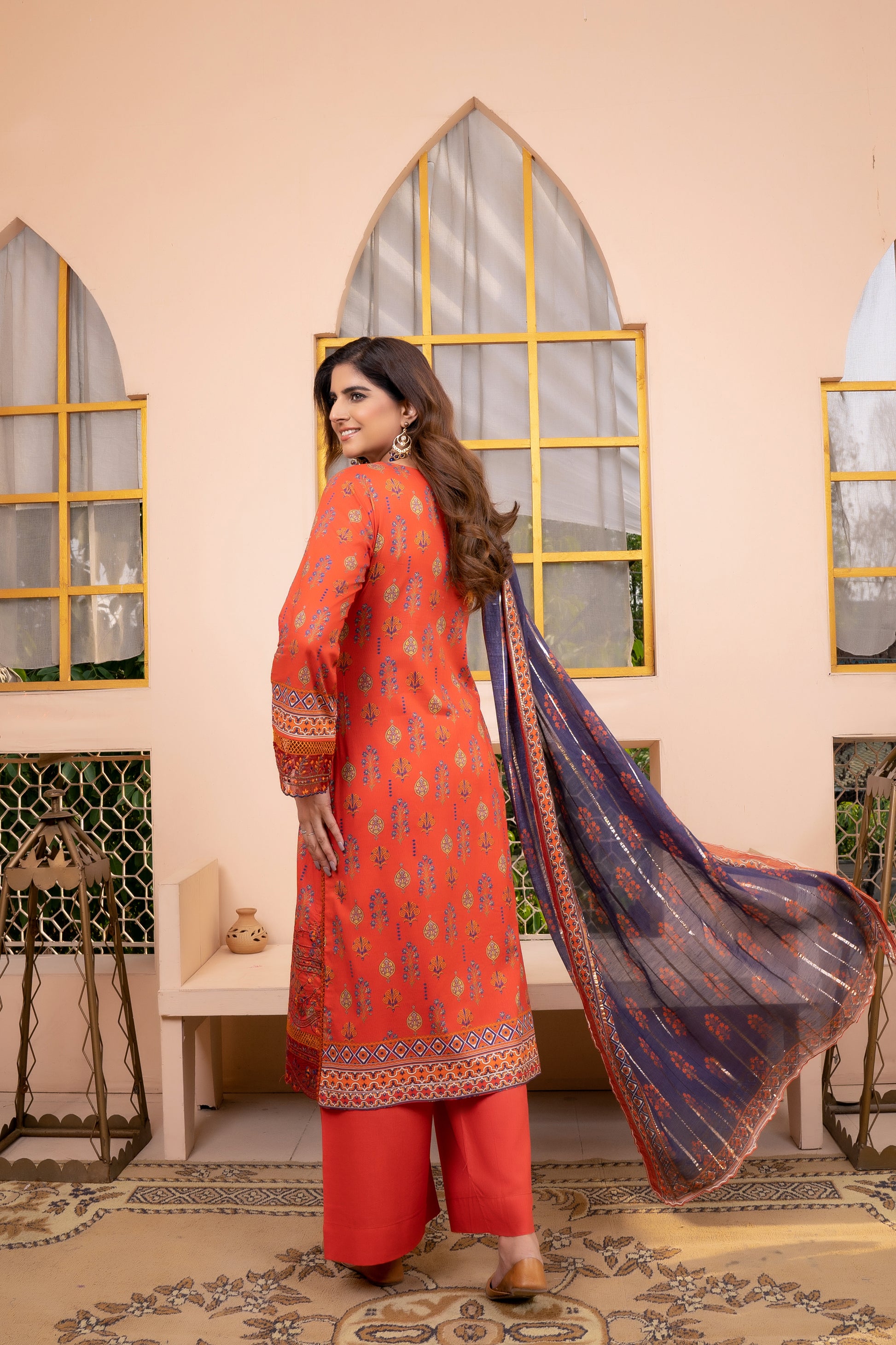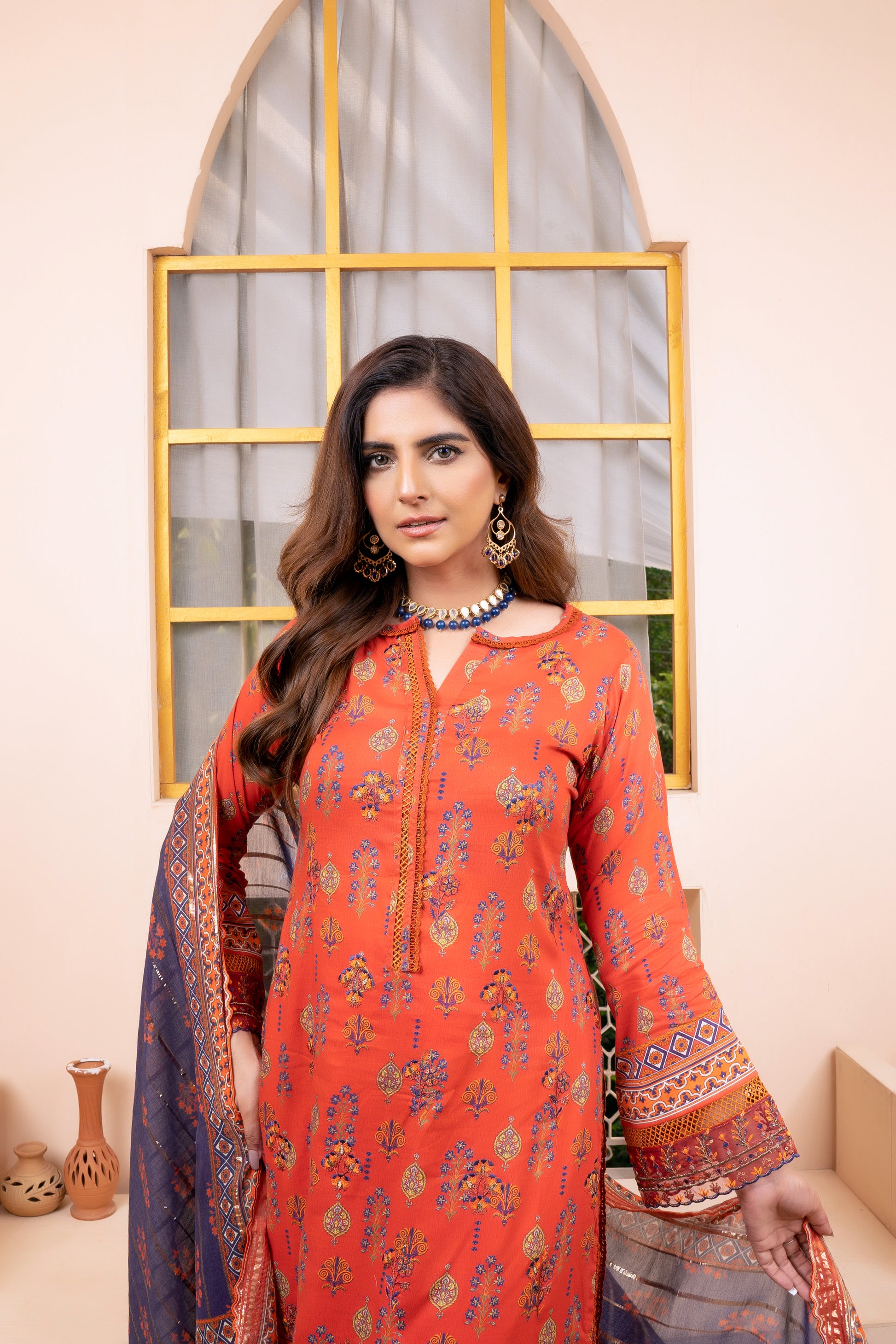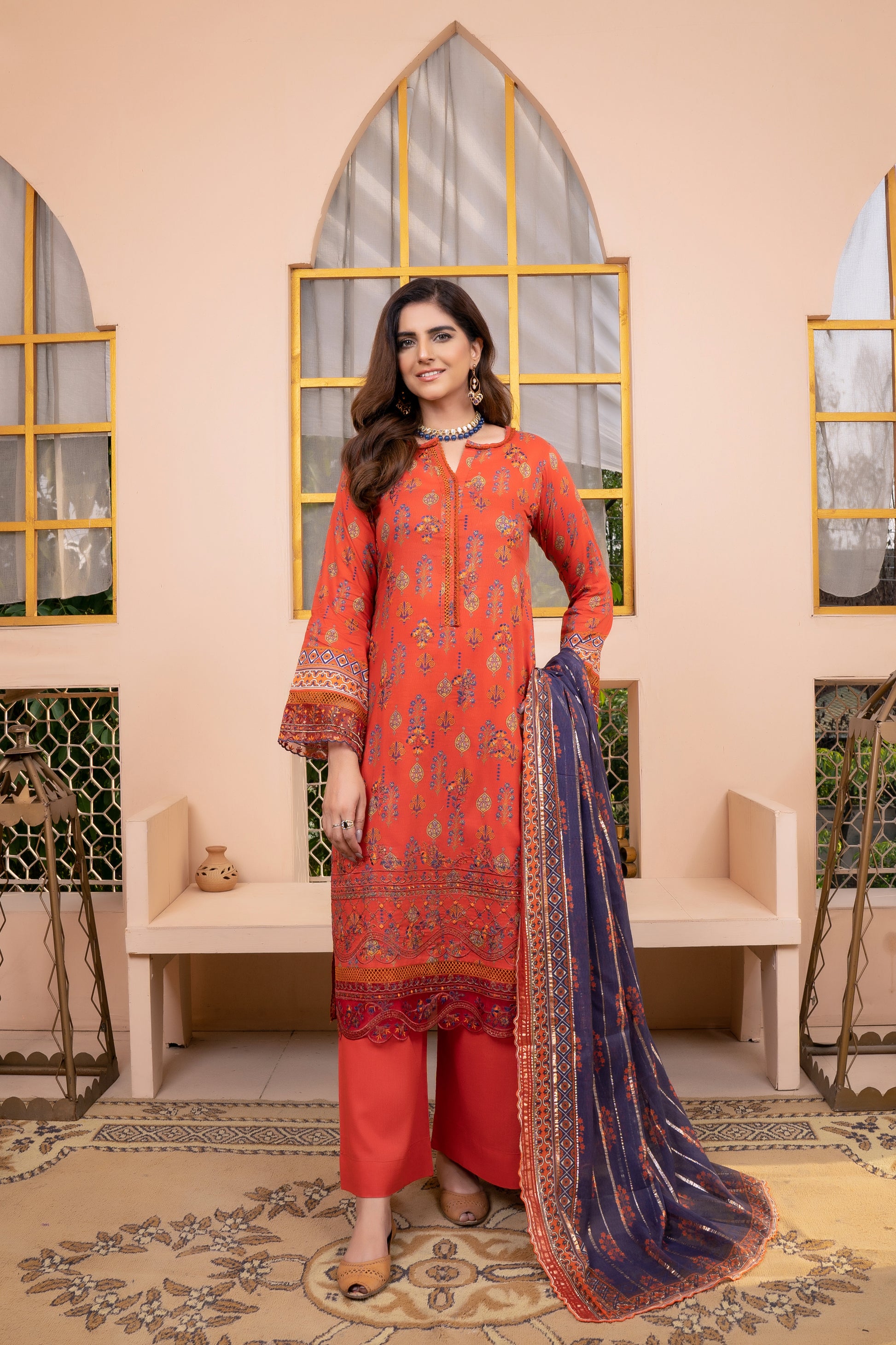 (Orange) 3Pc Printed Embroidered Lawn Dress by MUNIRA