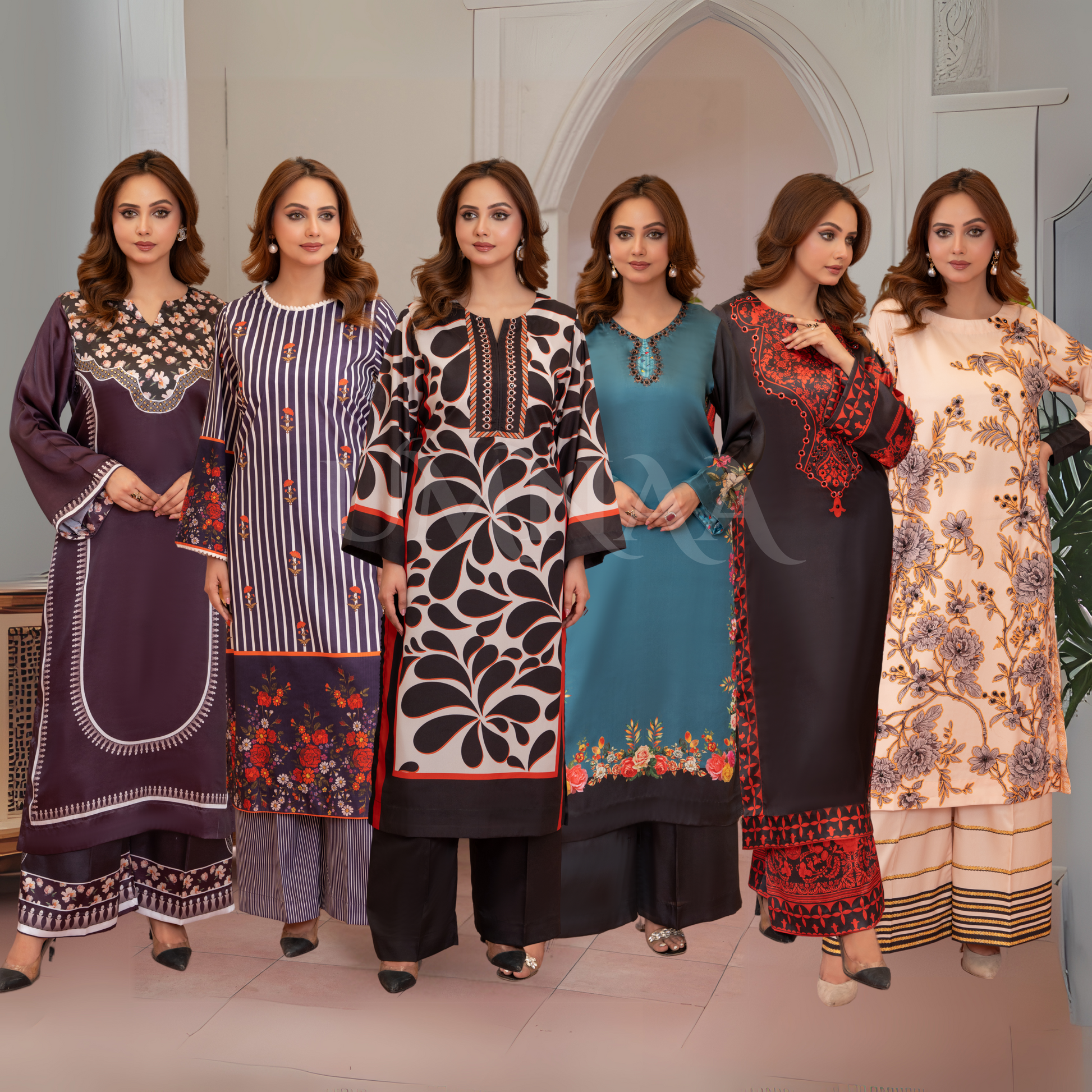 A blend of elegance and effortless charm stunning designs in luxurious silk. featuring 3 designs in premium Printed Shamooz Silk that soft sheen and graceful drape.3 designs in Printed lightweight Grip Silk - perfect for everyday elegance with a refined finish.