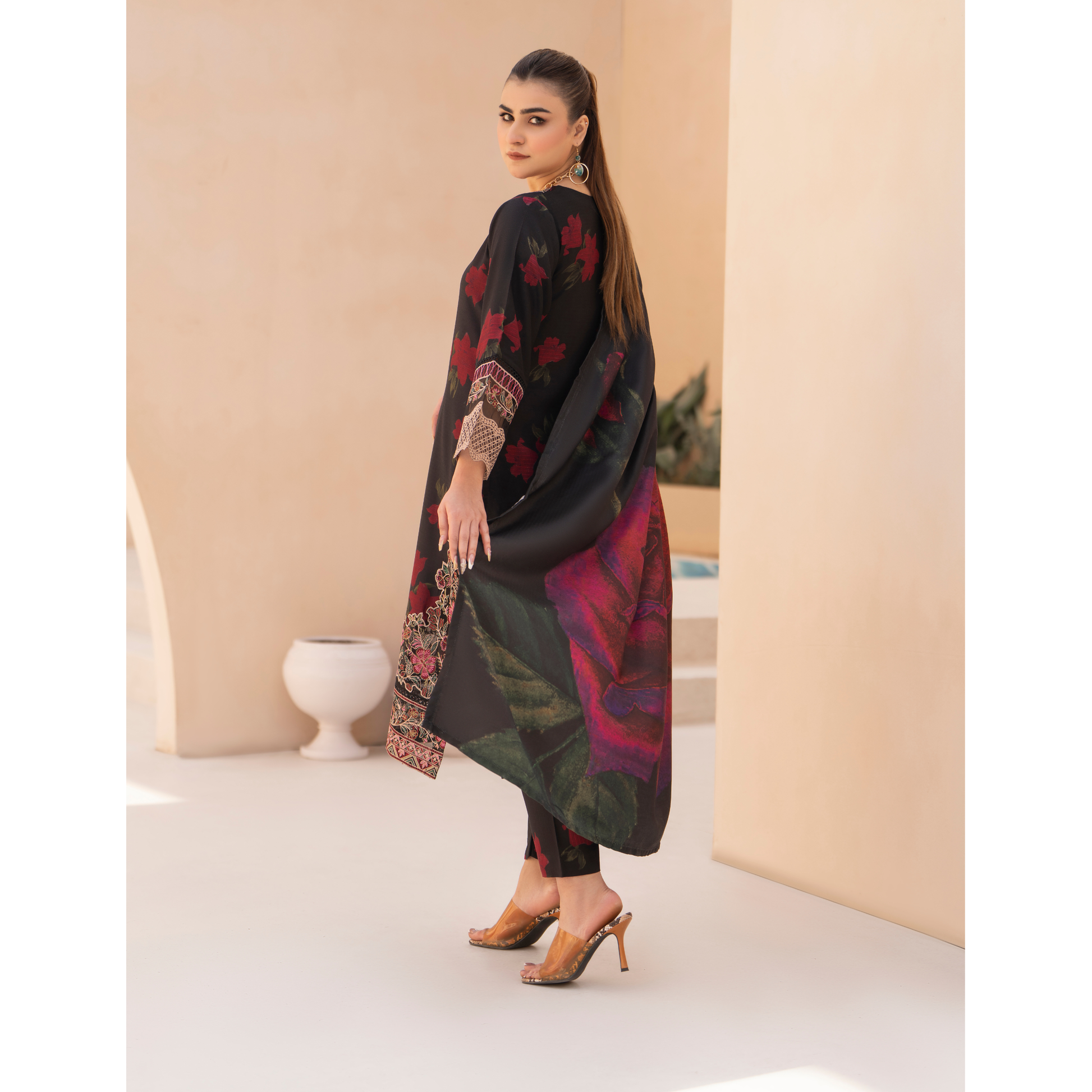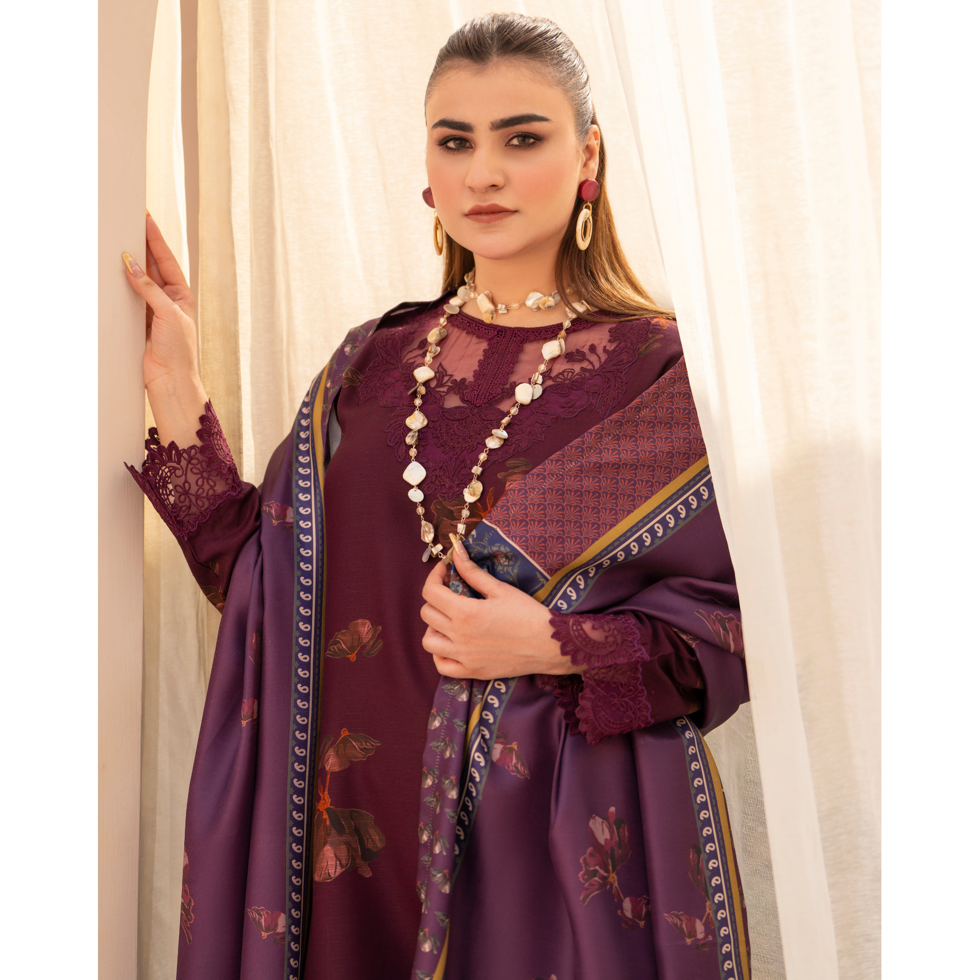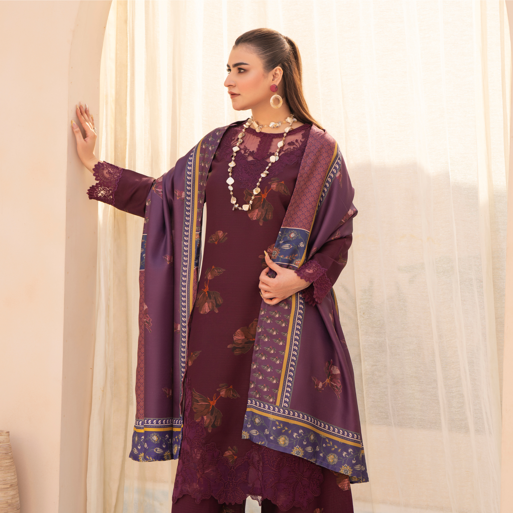 Experience the perfect blend of comfort and elegance with our Embroidered Dhanak Dress, beautifully paired with a Wool shawl. The shirt is crafted on soft Dhanak fabric, adorned with rich embroidery that enhances its winter charm. Its detailed motifs and refined borders create a timeless, luxurious look ideal for the season. The matching Dhanak trouser completes the outfit with a cohesive, warm feel. Draped over it is a stunning Wool shawl, woven with traditional patterns that add depth and sophistication while keeping you cozy. This ensemble captures the true essence of winter style—warm, graceful, and effortlessly classy.