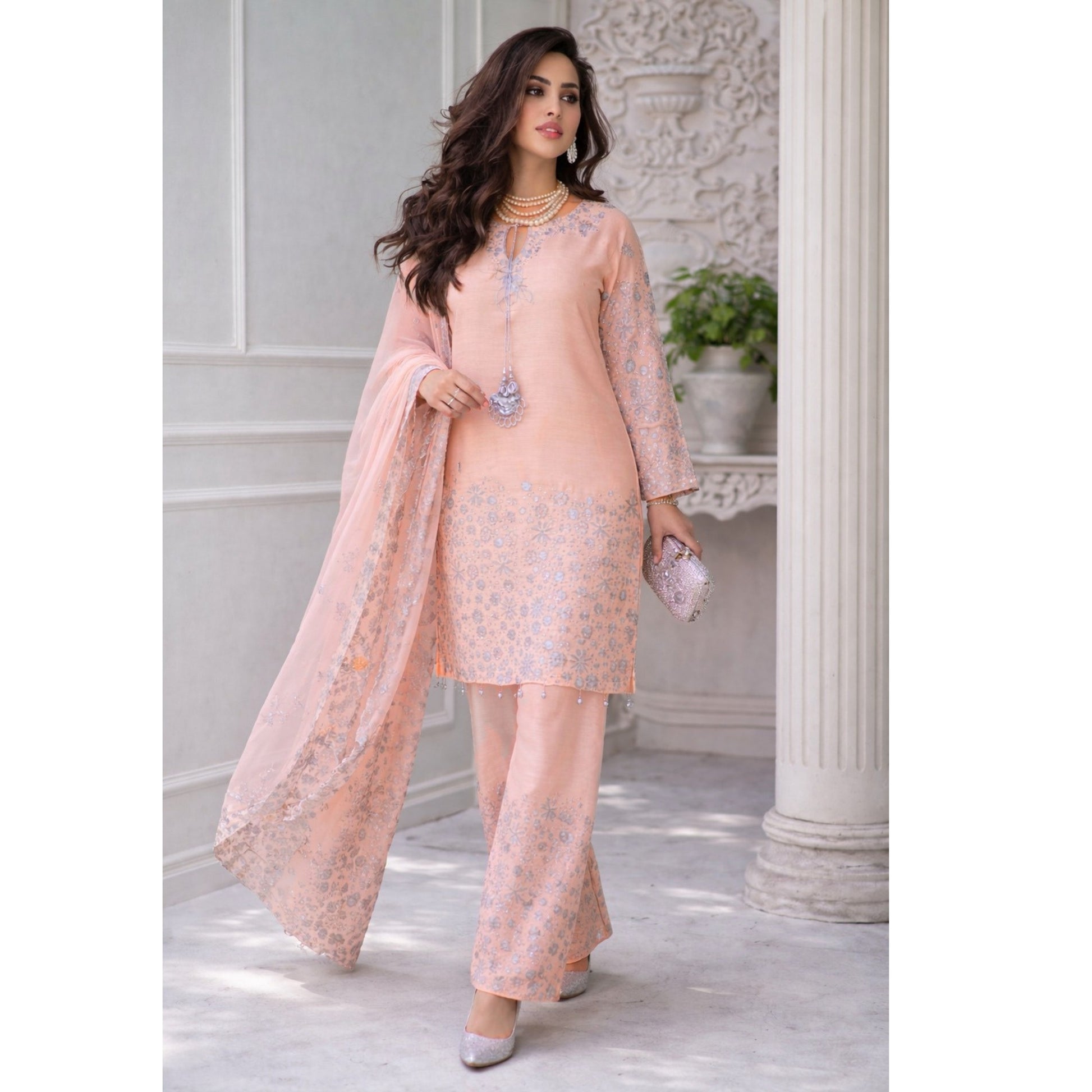 Paired with a lightweight organza dupatta finished with a soft, elegant border, this 3-piece set delivers a flowy, graceful drape ideal for formal gatherings, festive events, and evening occasions. Subtle silver detailing and refined embellishments complete the outfit, giving it a classy and timeless appeal.