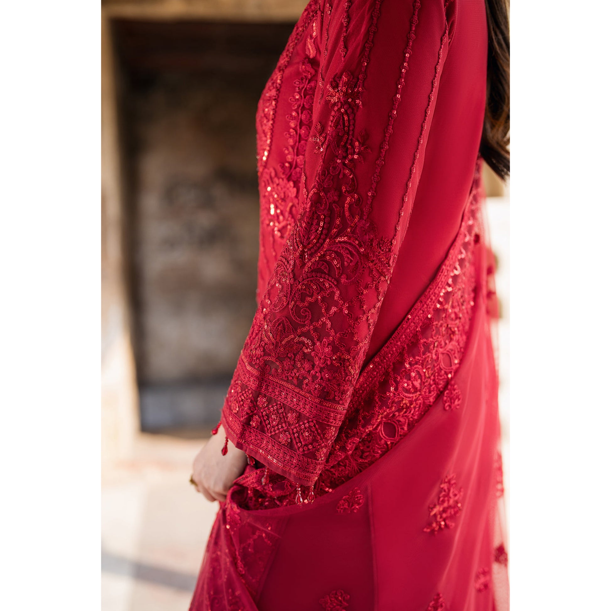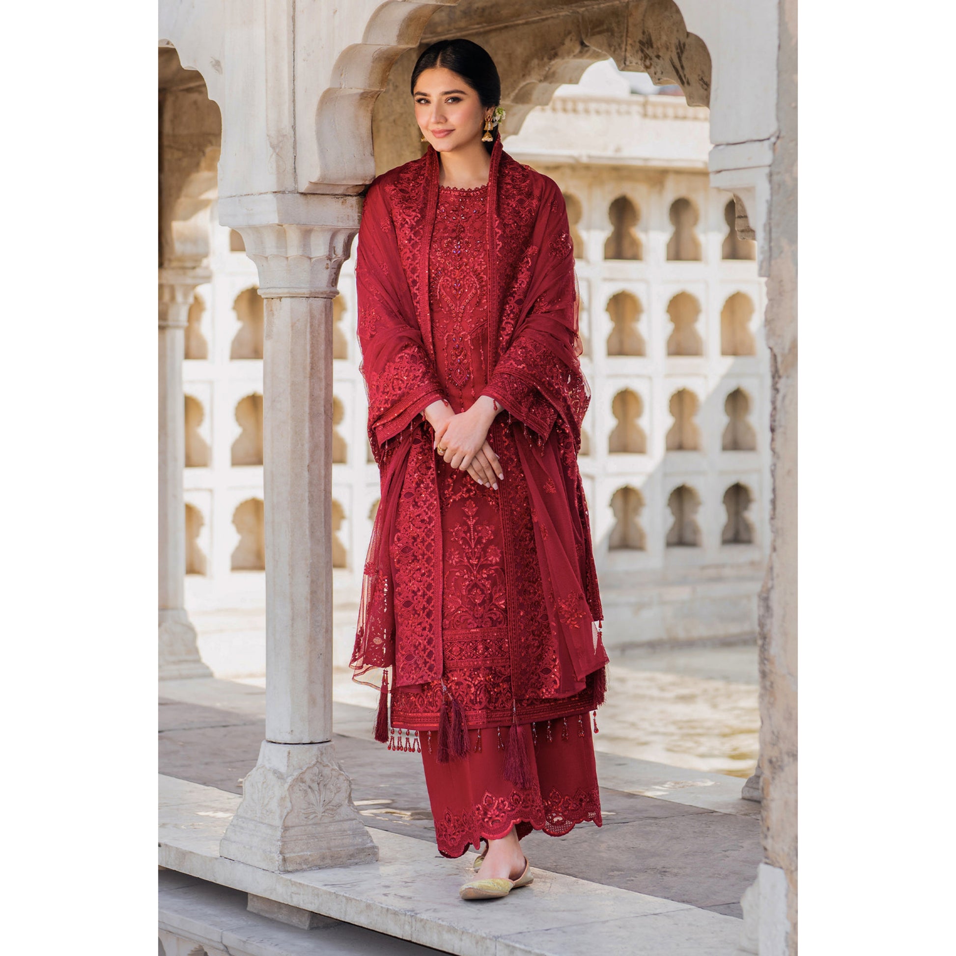 Imrozia inspired stitched 3-piece suit, featuring an intricately embroidered net front with a classic crew neckline, plain net back and sleeves with embroidered organza detailing, and a fully embroidered net dupatta. Paired with dyed raw silk trousers enhanced with an embroidered organza border for a refined, graceful finish.