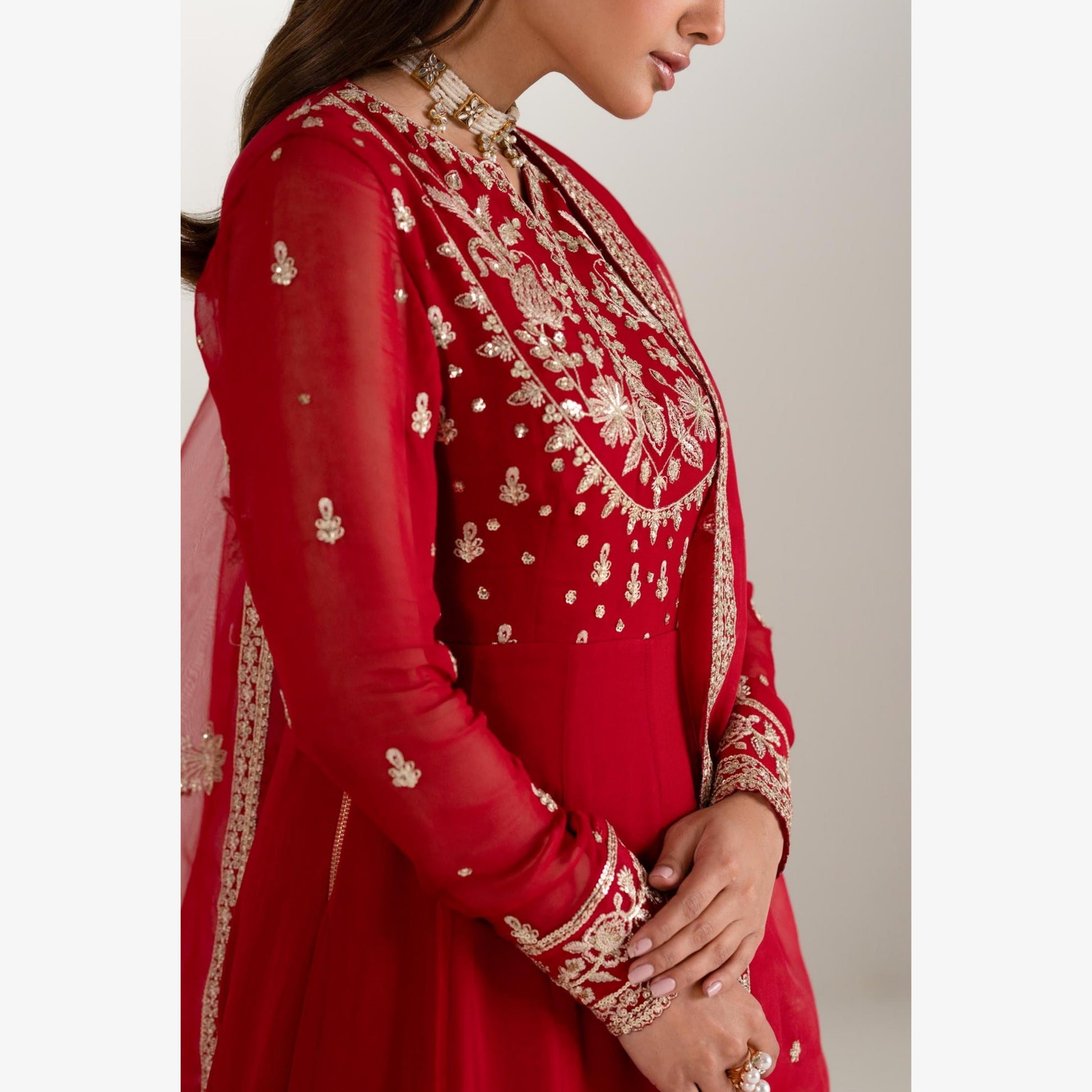 Flowing effortlessly to the floor, the frock features soft pleats that create a regal silhouette. The look is completed with a matching plainΒ trouser and chiffon dupatta, featuring light tilla and sequin embellishments throughout, bordered with a fine embroidered edge for a refined finish. A perfect blend of tradition and modern elegance, this ensemble is ideal for weddings, formal gatherings, and festive celebrations.