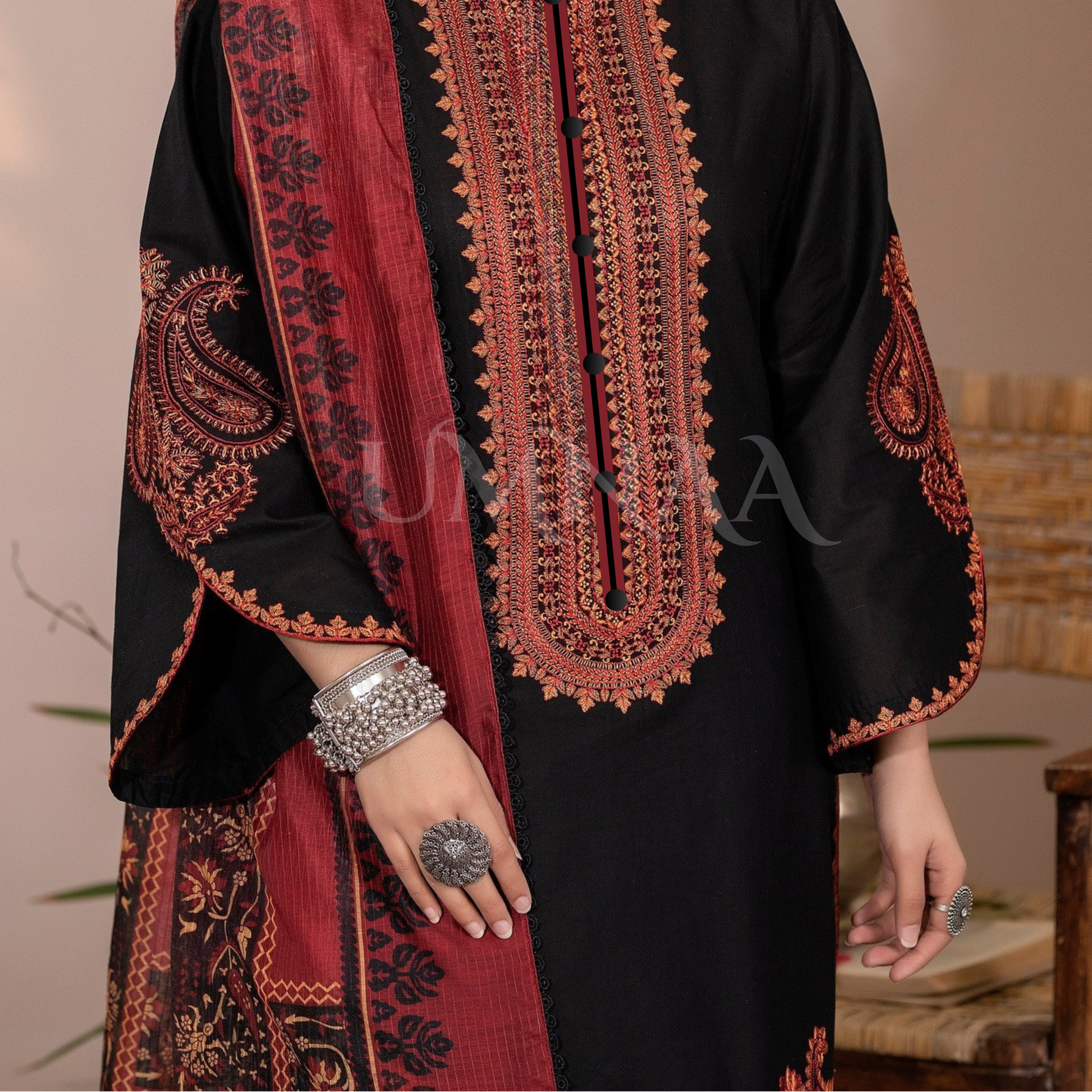 Introducing this stunning Slub linen collection, designed with rich embroidered detailing that brings timeless elegance to every piece. Each shirt features intricate embroidery on the neckline, sleeves, and daman, highlighted with vibrant threadwork that beautifully stands out against the deep, dark-toned base colors. The fine linen fabric ensures both comfort and sophistication, making it perfect for day-to-night wear. Paired with Embroidered Farshi shalwar that add a touch of charm and completed with a colorful, digitally printed dupatta, the outfit reflects a perfect balance of tradition and modernity. This ensemble is ideal for those who want a graceful yet stylish look for festive gatherings or casual outings.