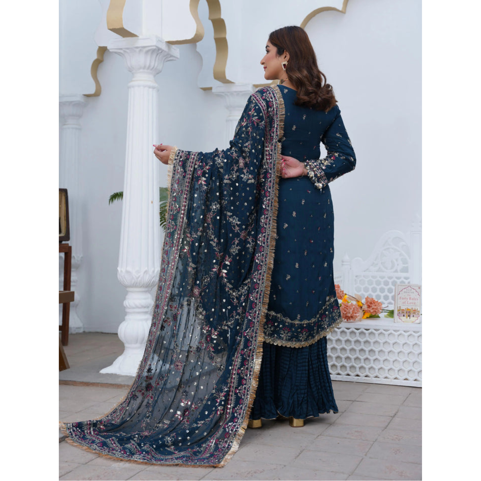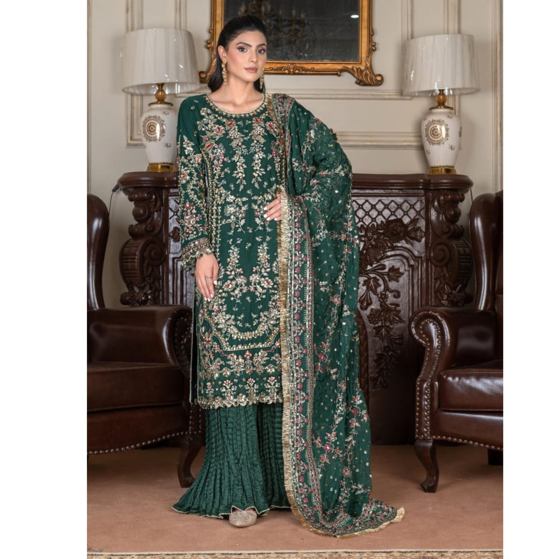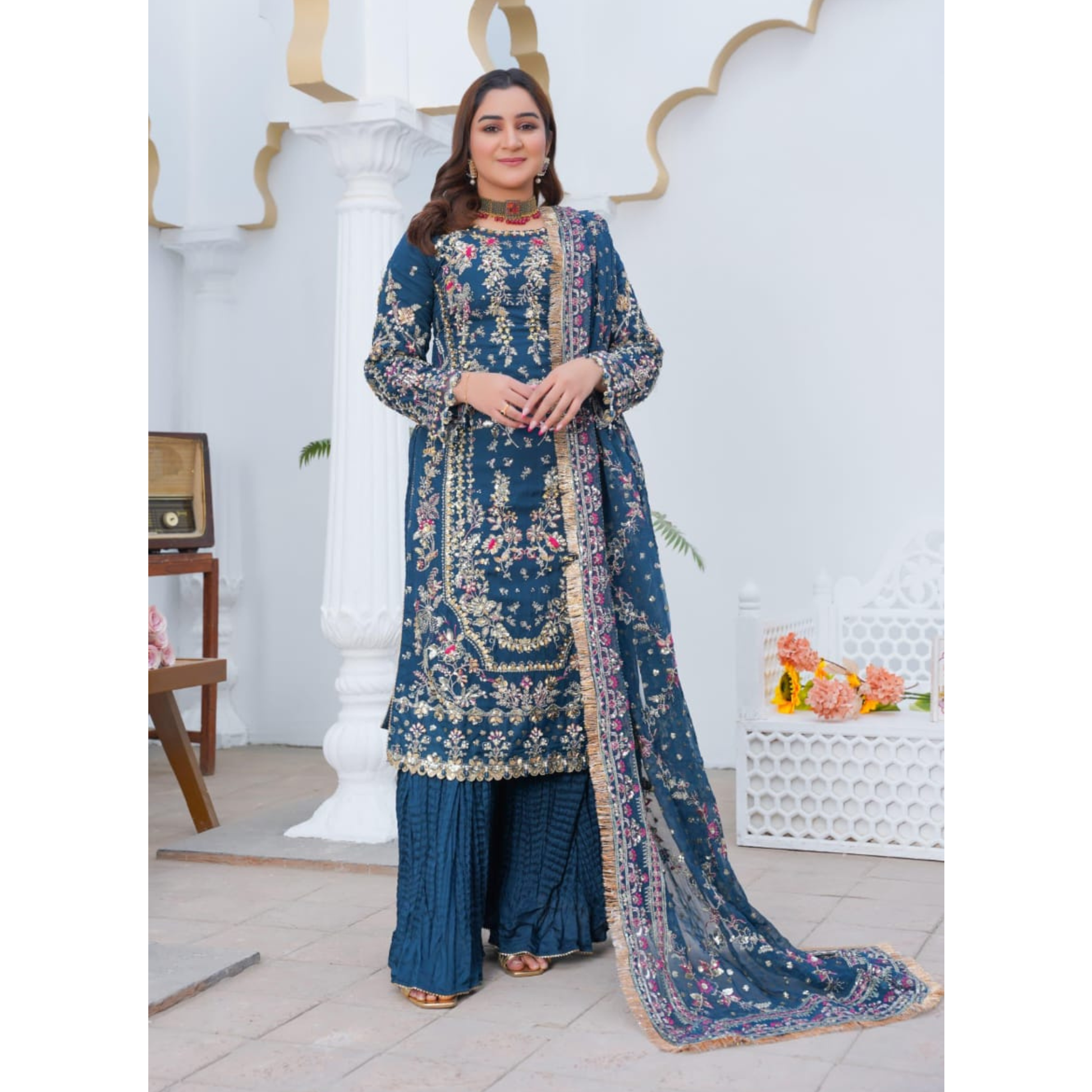 Introducing beautiful luxurious Chiffon Collection – a timeless festive look crafted to perfection. The outfit features a flowing trouser designed in a crushed fabric texture, giving it a rich, voluminous fall with effortless elegance. The wide-leg silhouette adds grace to every step, while the intricate gold and multi-hued embroidery on the kameez and dupatta creates a regal balance. Paired together, this design is perfect for evening occasions where you want to make a statement with sophistication.