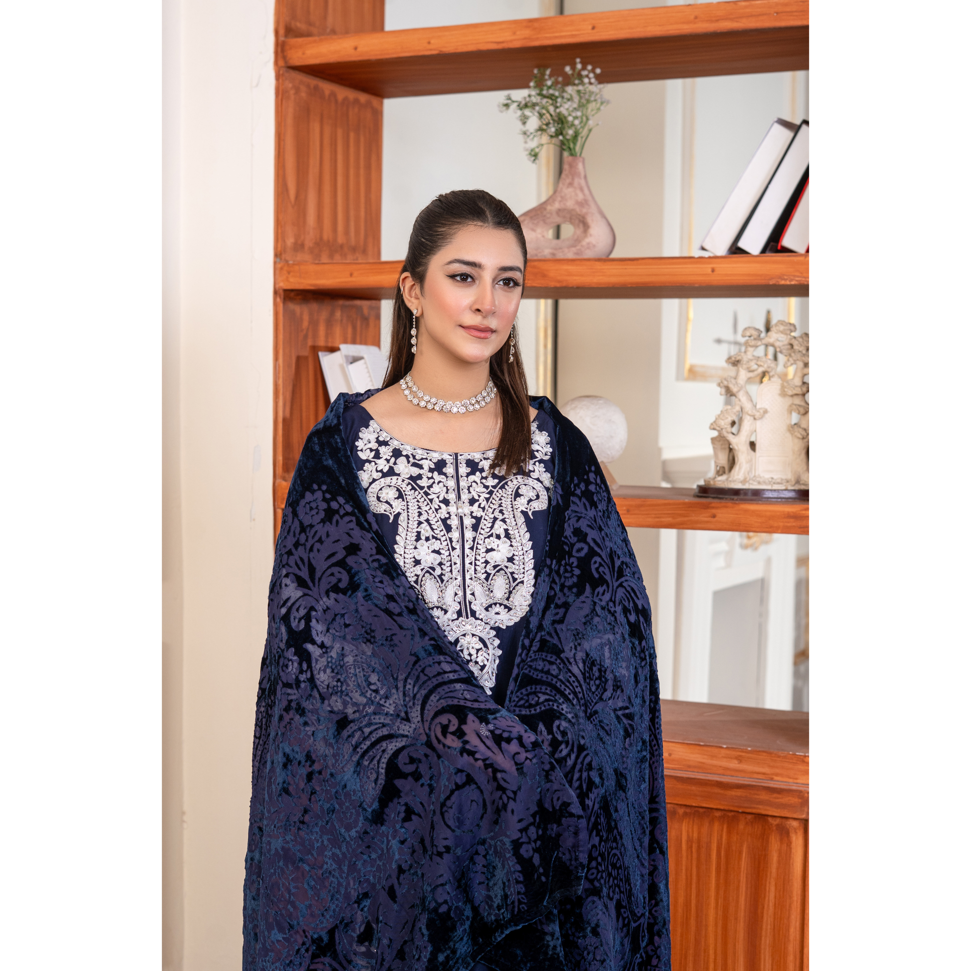 Introducing the Winter Linen Dress with Velvet Shawl by Umnaa – a perfect blend of elegance and warmth for the winter season. This luxurious Collection features linen shirt beautifully embellished with intricate white embroidery on the neckline, sleeves, and borders, giving it a graceful and timeless look. The plain dyed trouser complements the ensemble effortlessly, while the rich velvet shawl with detailed patterns adds a royal touch, making it ideal for both formal gatherings and winter festivities. Crafted with premium quality linen fabric, this outfit ensures comfort, style, and durability throughout the cold season. Pair it with classic jewelry and heels to complete your sophisticated winter look. winter collection, suit, embroidered dress, Pakistani outfit, velvet shawl, Umnaa clothing, formal wear, luxury pret , winter fashion 2025, festive wear, stitched 3 piece, elegant winter dress.