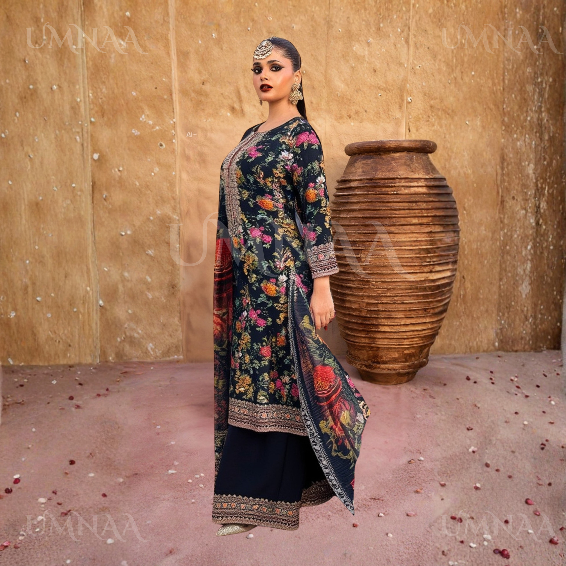 Introducing the Umnaa Viscose Linen collection! Elevate your style with our dress, adorned with exquisite embroidery. Dress is paired with a beautifully printed dupatta and a flowing Plazo shalwar, perfect for making a statement. Discover timeless elegance and unmatched craftsmanship.