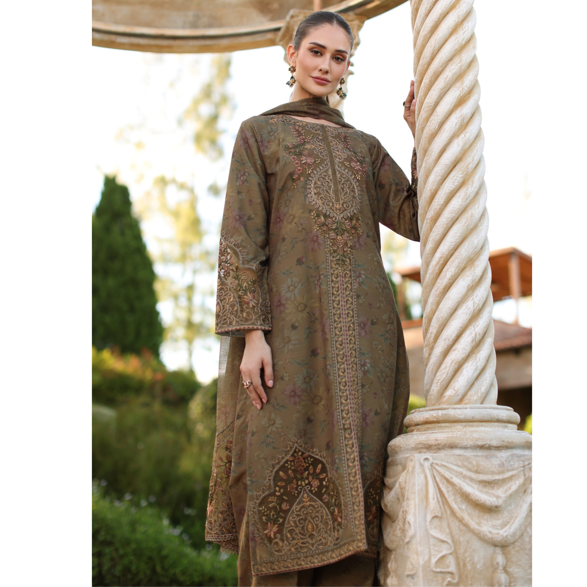 This Khaddar Printed Embroidered Dress is a perfect fusion of comfort and sophistication. The shirt is crafted from premium winter khaddar, adorned with delicate embroidery and intricate prints, giving it a rich traditional look. The embroidery highlights the neckline, sleeves, and borders, adding a subtle touch of luxury to the overall design.