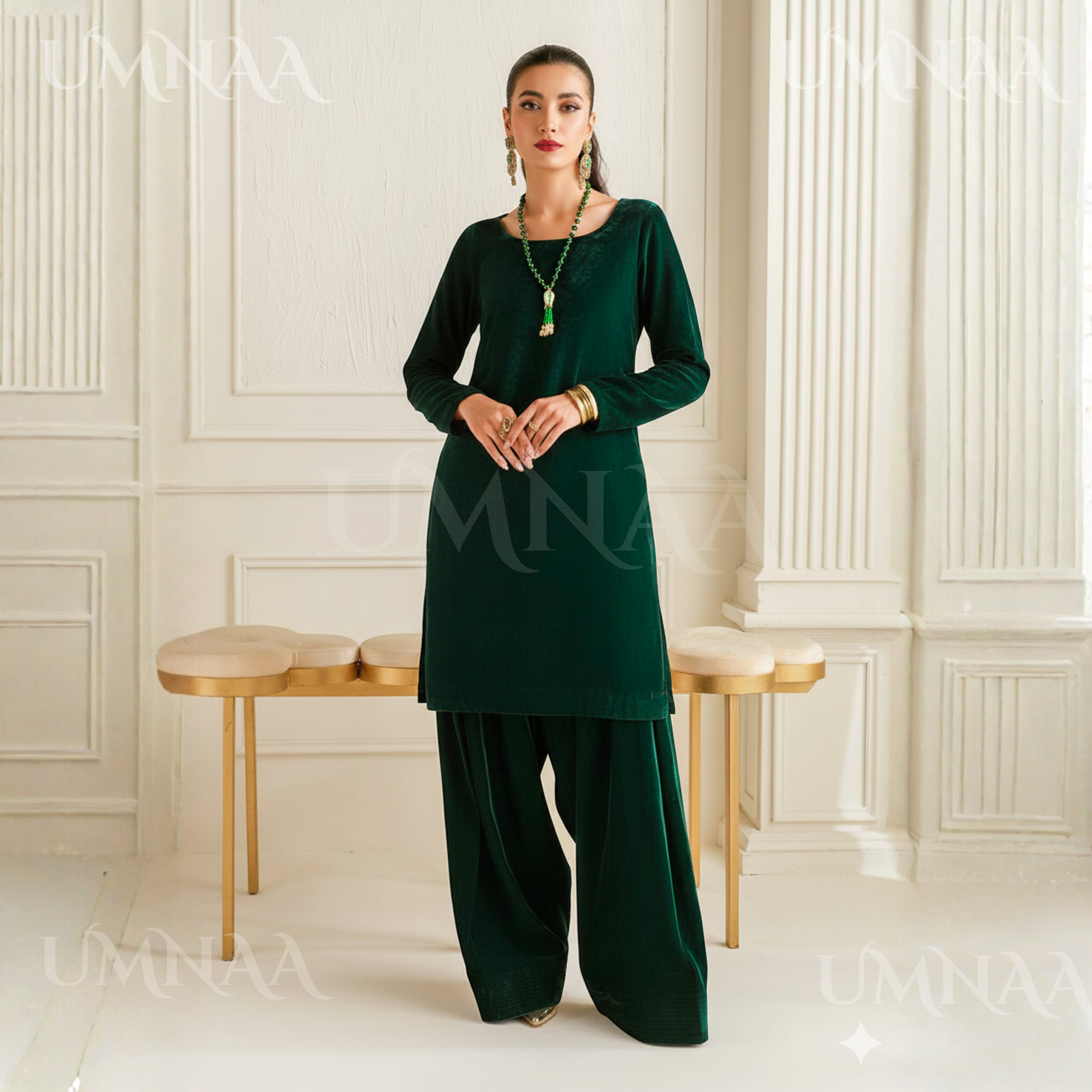 Introducing Velvet Farshi Shalwar Co-Ords set by Umnaa — a luxe velvet Co-Ords collection designed to bring effortless elegance to your winter wardrobe. Crafted from premium, ultra-soft velvet, each set features a timeless straight-cut shirt paired with wide-leg Farshi Shalwar for a graceful, flowy silhouette.