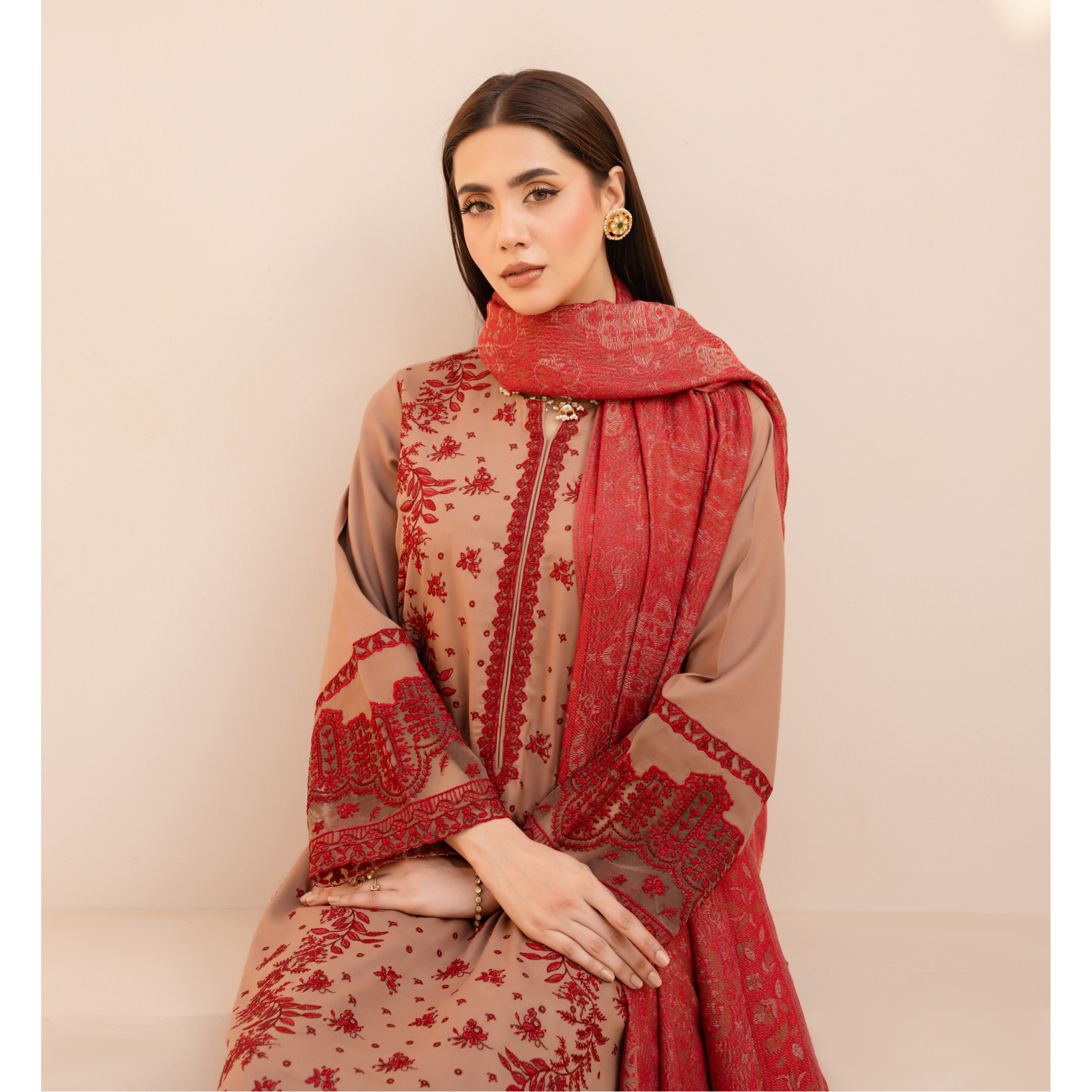 Crafted on premium dyed embroidered Dhanak shirt, paired with a matching dyed Dhanak trouser, this outfit is designed to keep you stylishly warm. The look is completed with a luxurious Pashmina shawl, beautifully printed for a chic finishing touch.