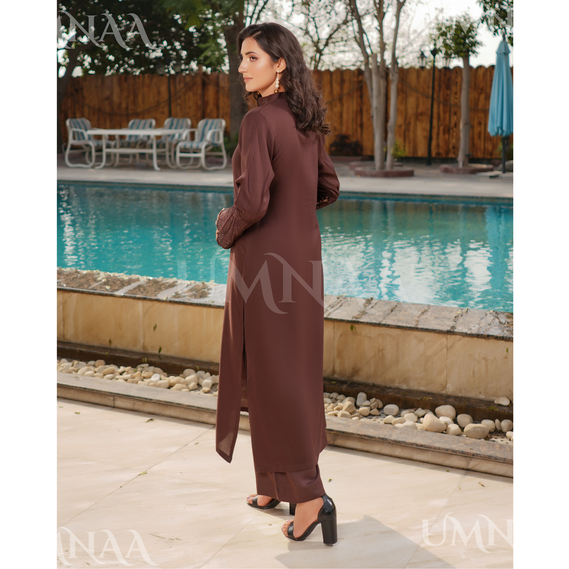 Step into the season with our new Dhanak Co-Ords Set, the ultimate blend of comfort and contemporary style. Crafted from soft, medium-weight Dhanak fabric, this two-piece ensemble is designed to keep you warm and cozy while maintaining an effortlessly chic look. The set features a modern, A Line cut -style kurti with embroidered sleeves that boasts a sophisticated look. Adding a unique touch are the prominent. The kurti is perfectly paired with a trouser, creating a fashionable profile that’s easy to move in and exceptionally comfortable. This ready-to-wear collection is a perfect Co Ord Set for every winter occasion. Embrace minimalist elegance and maximum warmth with this essential winter outfit!