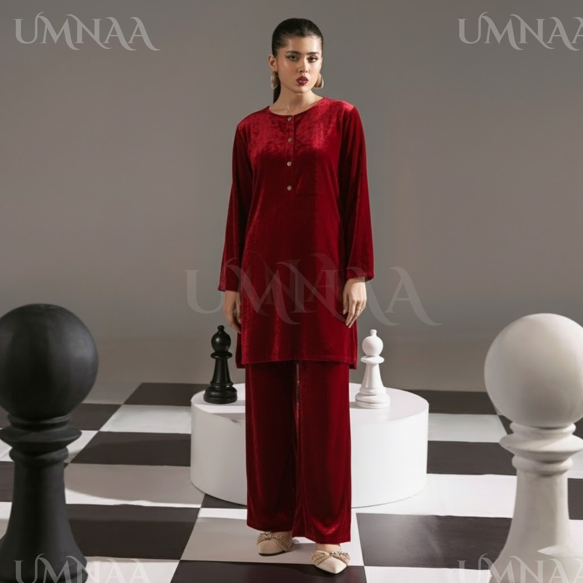 Introducing Velvet Farshi Shalwar Co-Ords set by Umnaa — a luxe velvet Co-Ords collection designed to bring effortless elegance to your winter wardrobe. Crafted from premium, ultra-soft velvet, each set features a timeless straight-cut shirt paired with wide-leg Farshi Shalwar for a graceful, flowy silhouette.
