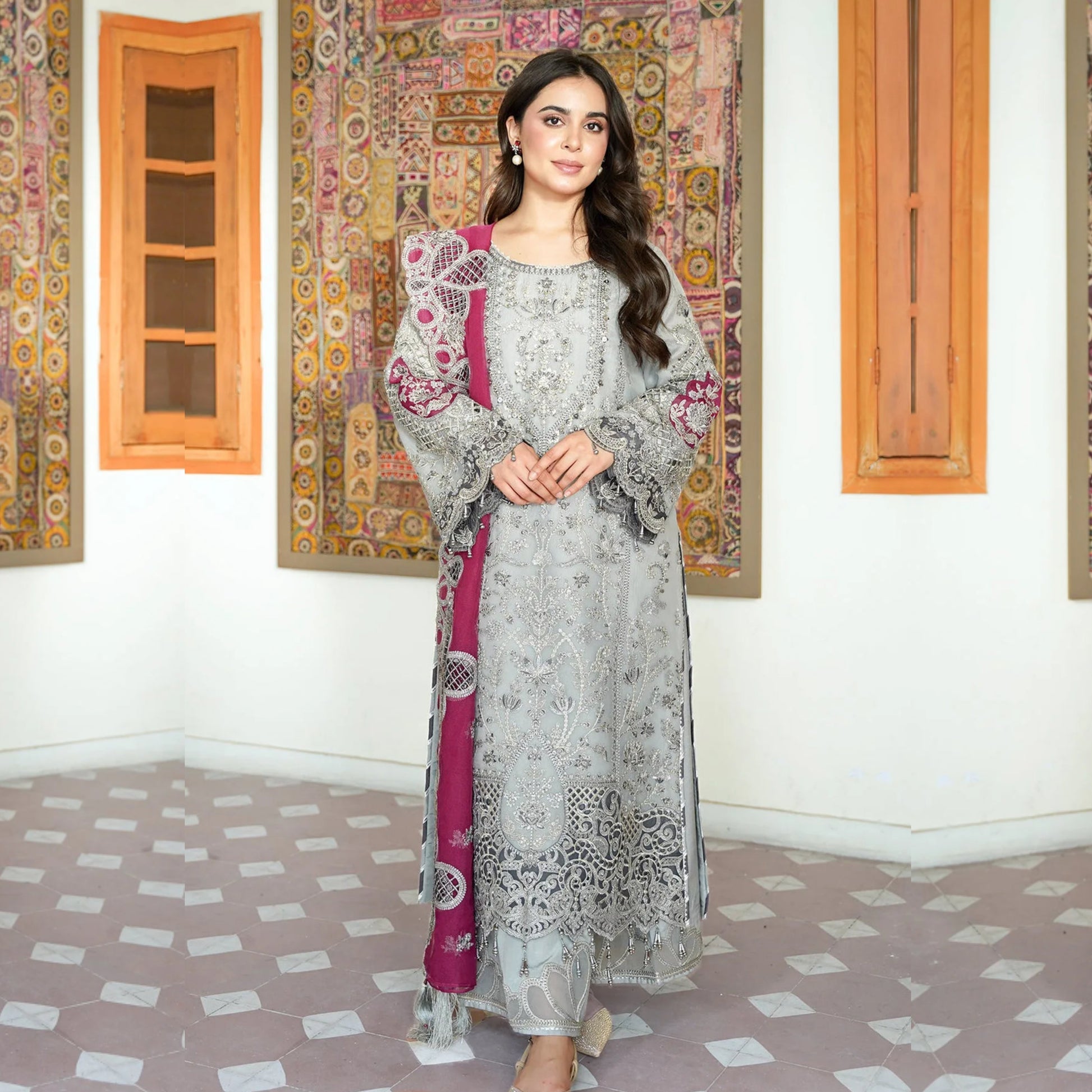 Imrozia inspired stitched 3-piece suit, featuring an intricately embroidered organza front with a classic neckline, plain organza back and sleeves with embroidered organza detailing, and a fully embroidered khaddi net dupatta. Paired with Embroidered dyed raw silk trousers enhanced with an embroidered organza border for a refined, graceful finish.