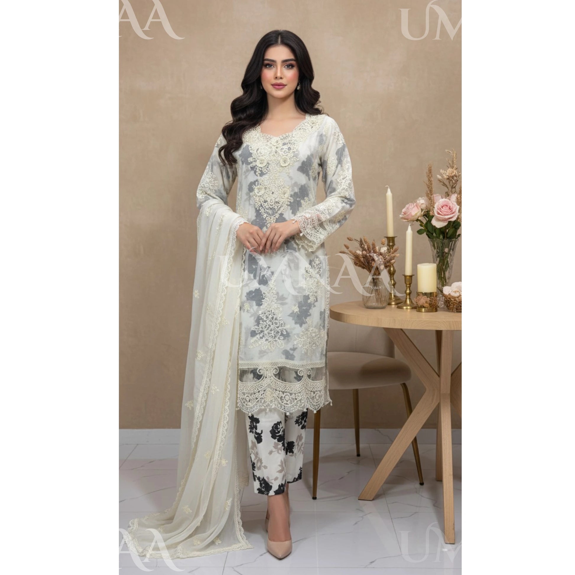 UA-165 Embroidered Chiffon 3-Piece with Printed Lining & Trouser