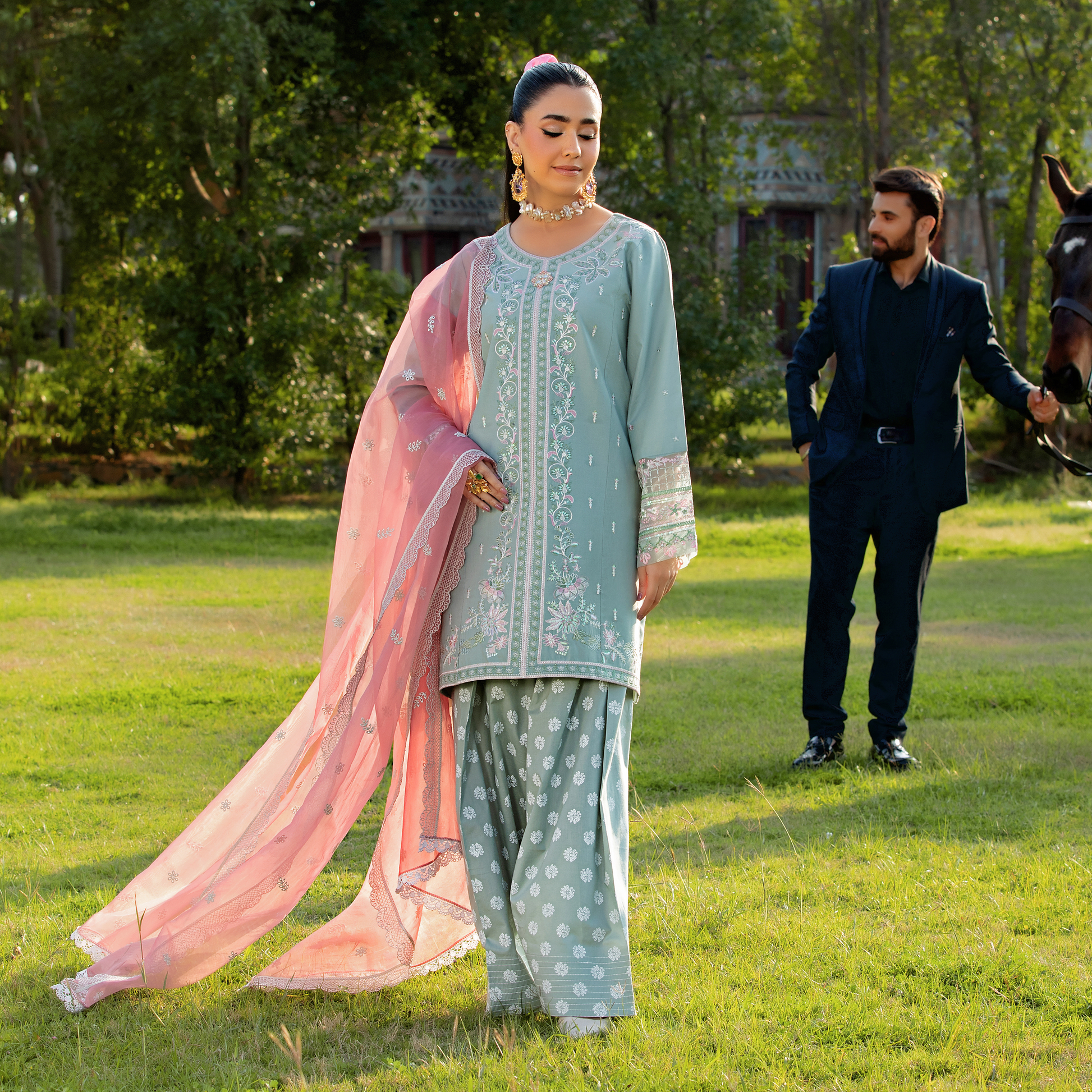 UHE-52 (Light pistachio) 3 Pc Embroidered Cambric Cotton trending Farshi Shalwar ready to wear Dress | Summer Wear | Heera's