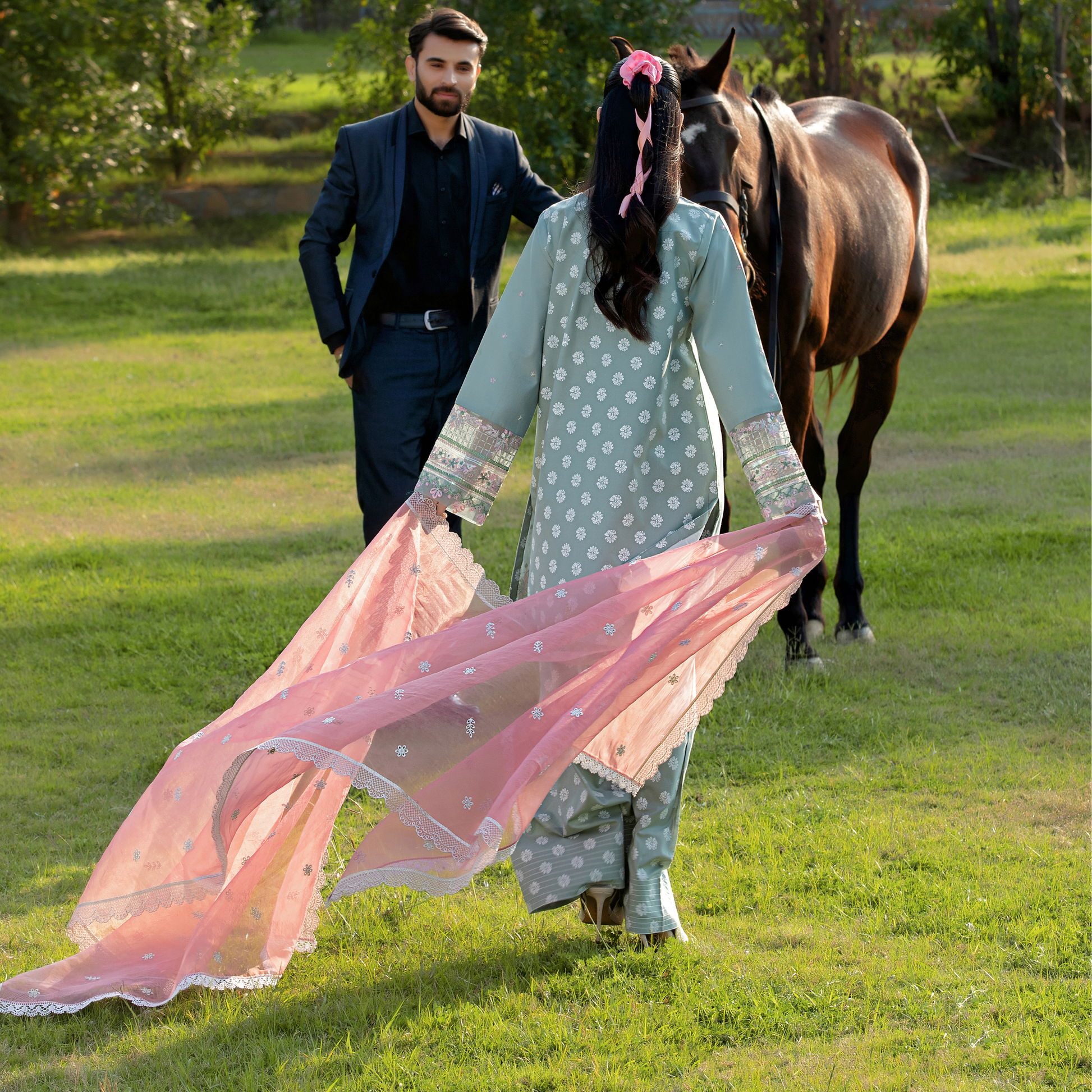 The dupatta is made of organza and has delicate embroidery with lacework, giving it a luxurious and elegant finish.