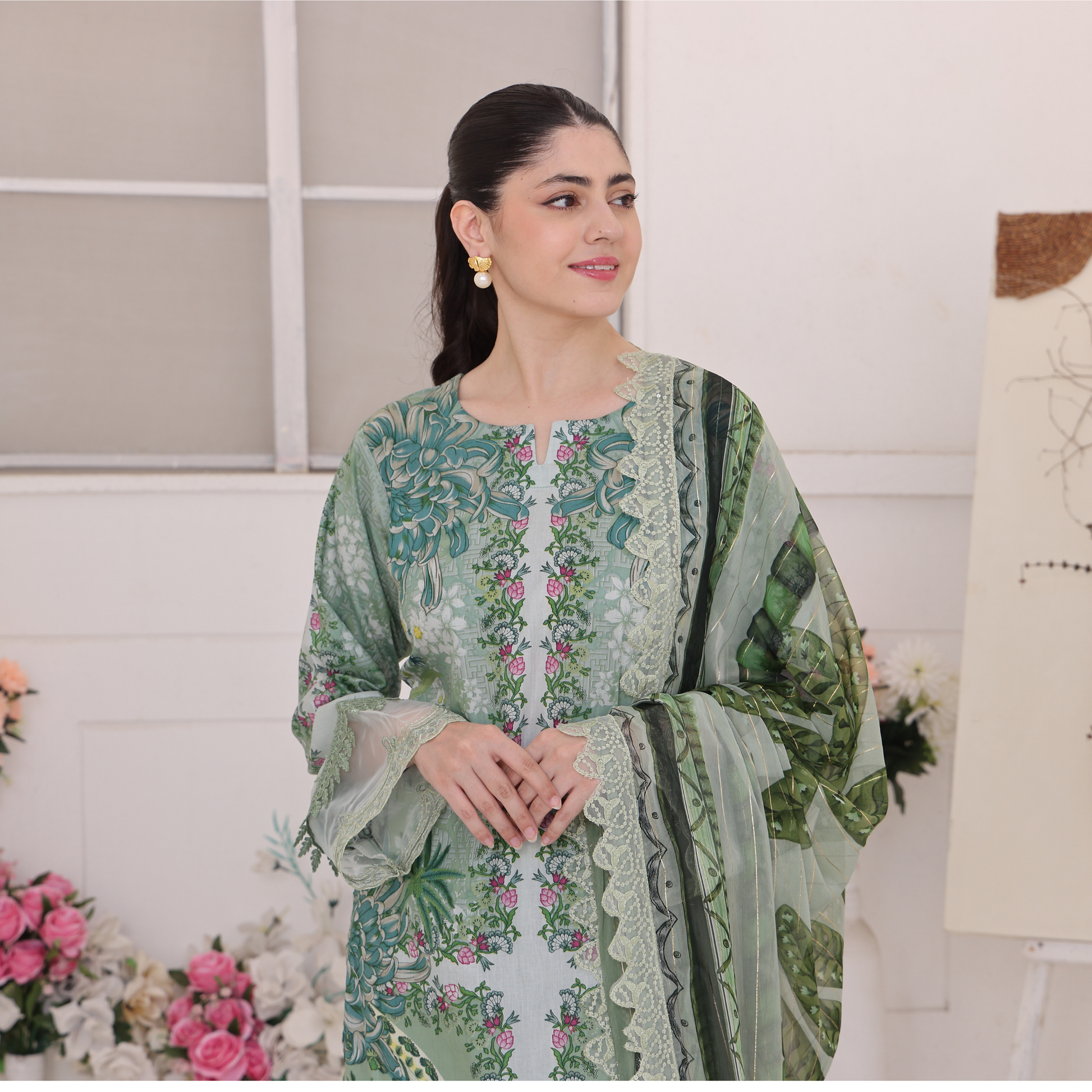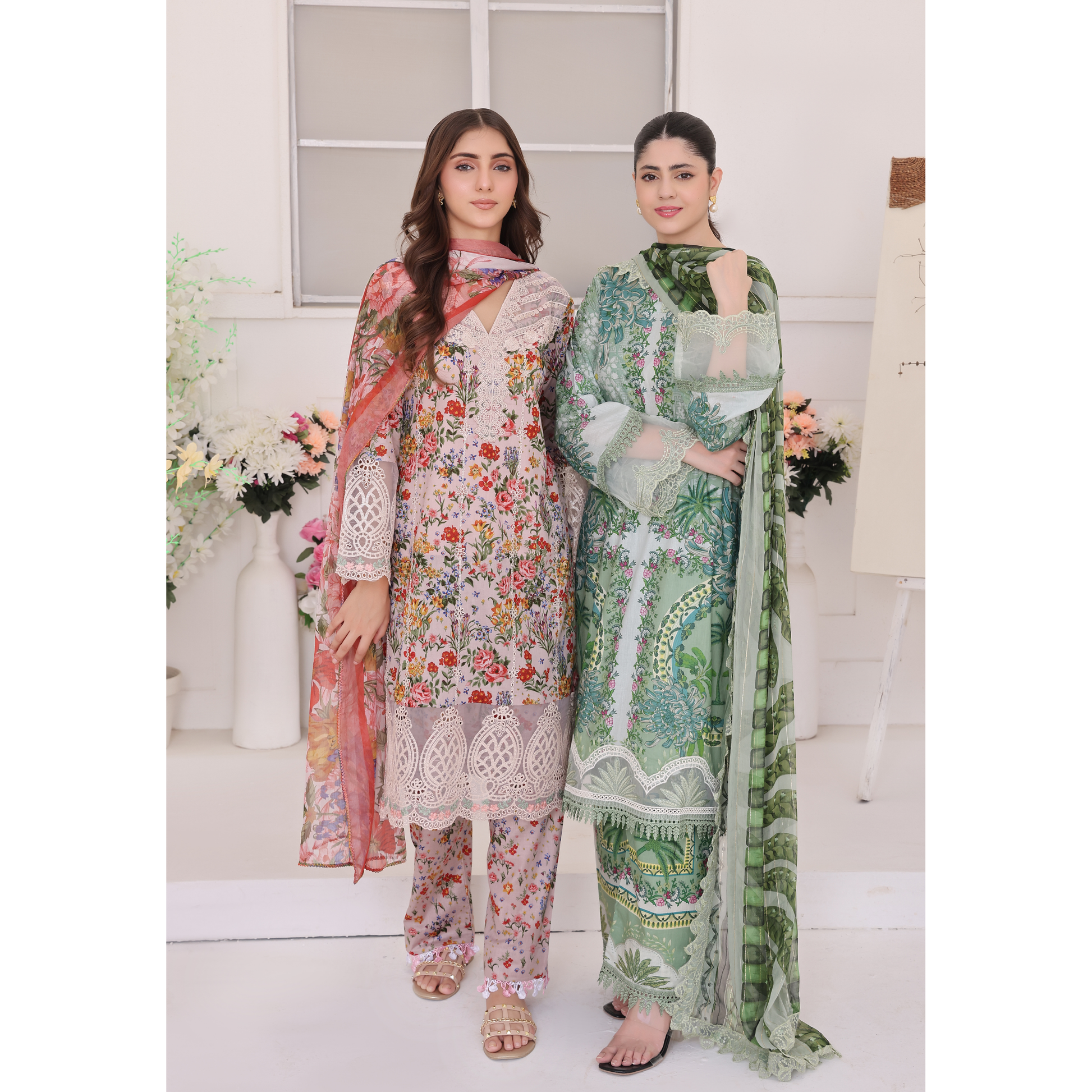 Introducing the beautiful Maria.B inspired Summer Collection, a celebration of elegance and vibrancy in printed Lawn dresses perfect for the season. Each ensemble is a fusion of soft, breathable fabric and rich, detailed prints that capture the essence of summer. The dresses feature a stunning array of floral patterns, intricate lace accents, and delicate embroideries, ranging from soft pastels to bold, vivid tones. Flowy dupattas complement the designs with sheer grace, while the shirts are adorned with stylish necklines, hemline fringes, and traditional motifs that add a sophisticated charm. The trousers, kept simple or lightly printed, balance the ornate tops effortlessly. This collection brings together modern style and timeless tradition, ideal for festive days and everyday grace alike.