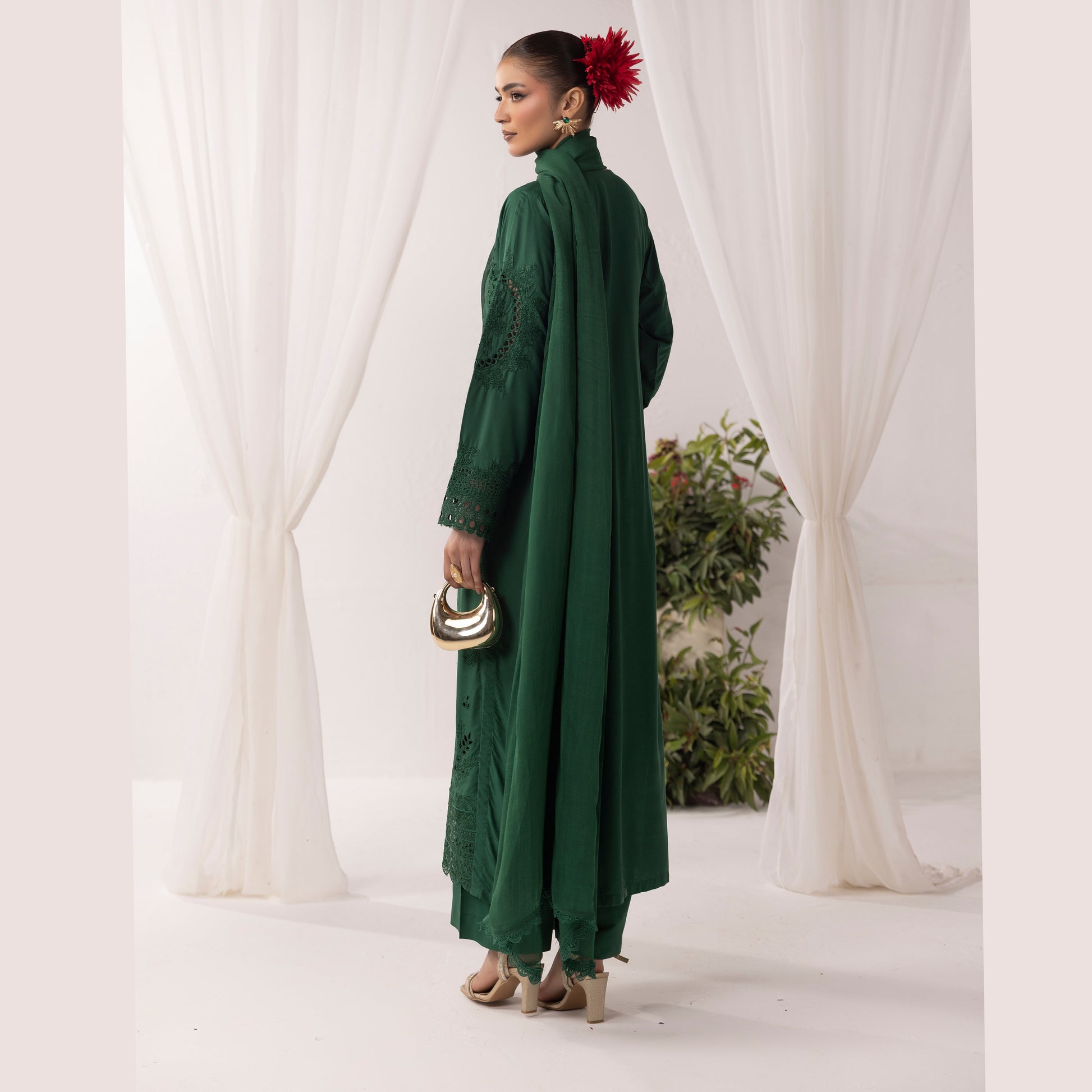This stunning 3-piece winter linen outfit features a beautifully embroidered shirt adorned with intricate cutwork detailing on the sleeves and border, giving it a rich and graceful finish. The V-neckline adds a touch of modern elegance, while the fine embroidery enhances the luxurious winter vibe.