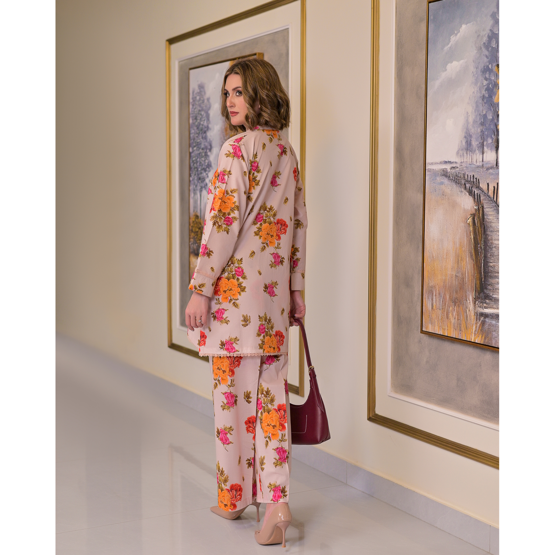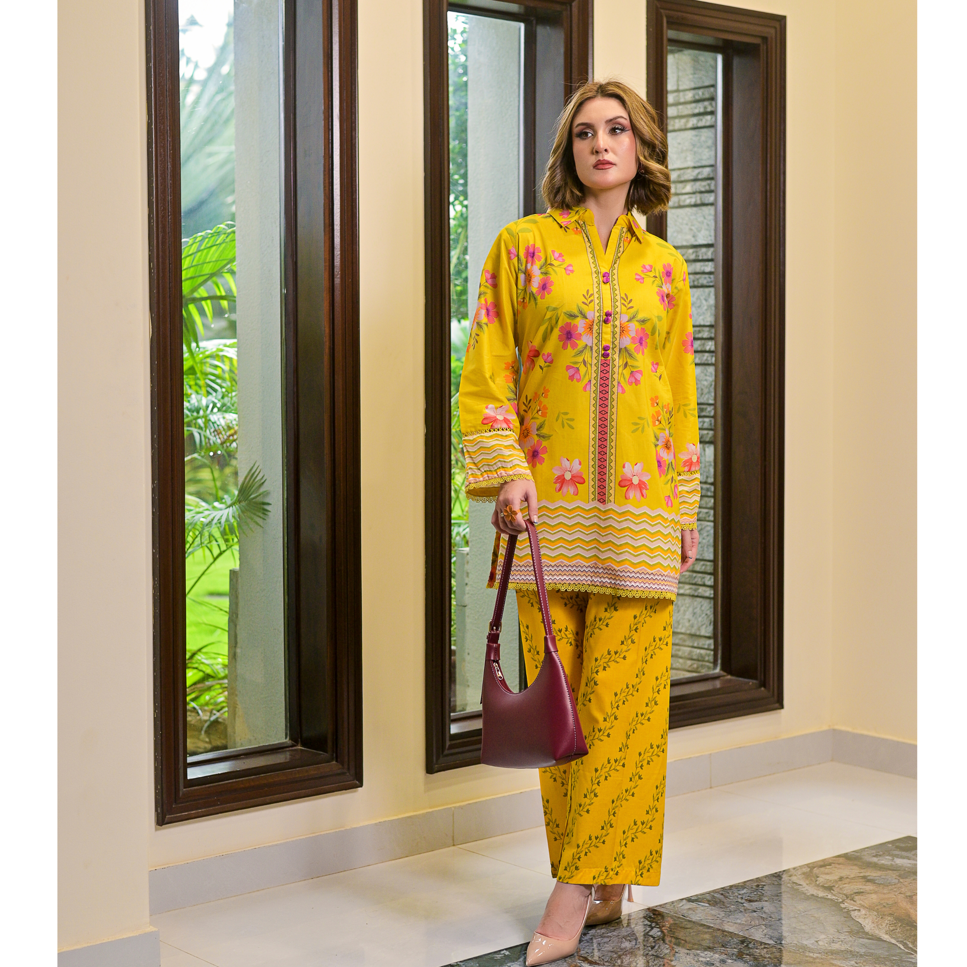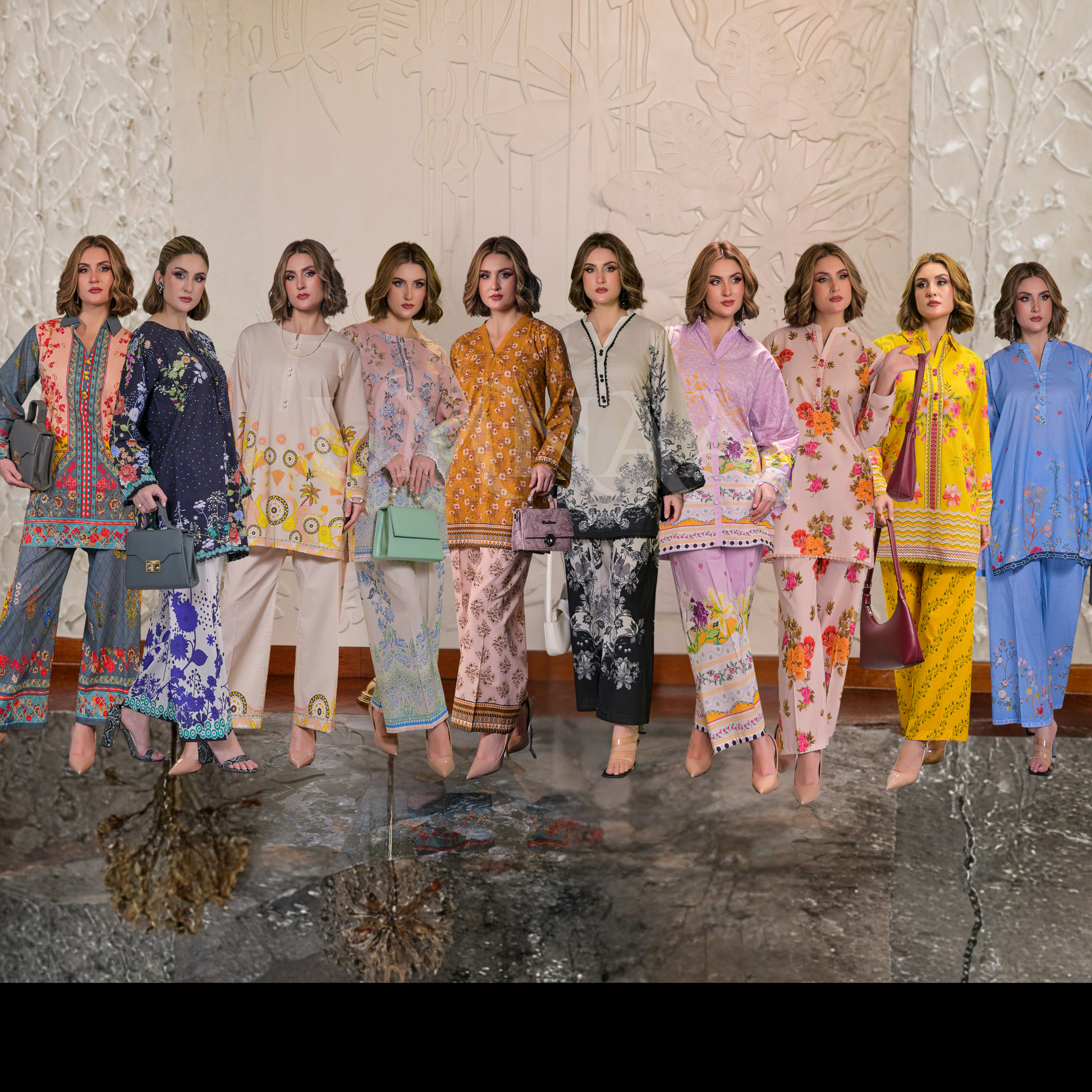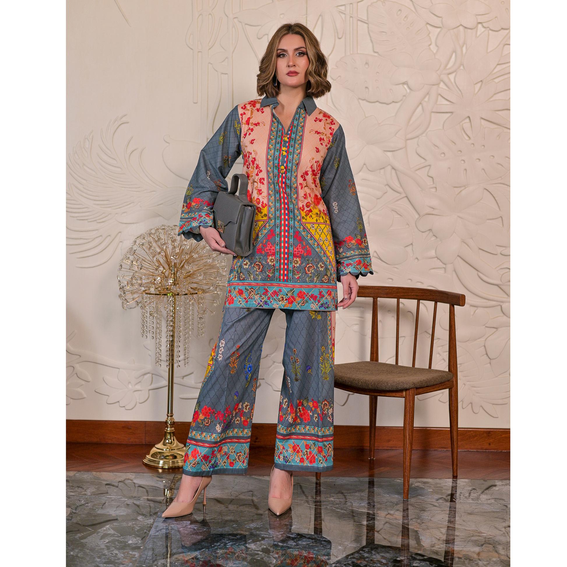 Introducing a vibrant range of Cambric Cotton Printed Co-Ord Sets designed to bring comfort and charm to your everyday wardrobe. Each ensemble features a soft, breathable Cambric Cotton fabric that offers a flattering fall and all-day ease. The shirts are adorned with detailed digital prints inspired by florals, foliage, and ethnic patterns, thoughtfully spread across bold and pastel color palettes. Trousers are coordinated with matching or complementing prints to complete the cohesive look. Finishing touches like lace trimmings, sleek piping, and printed borders enhance the overall design, making these sets a perfect choice for casual wear, Winter outings, or festive daytime events.