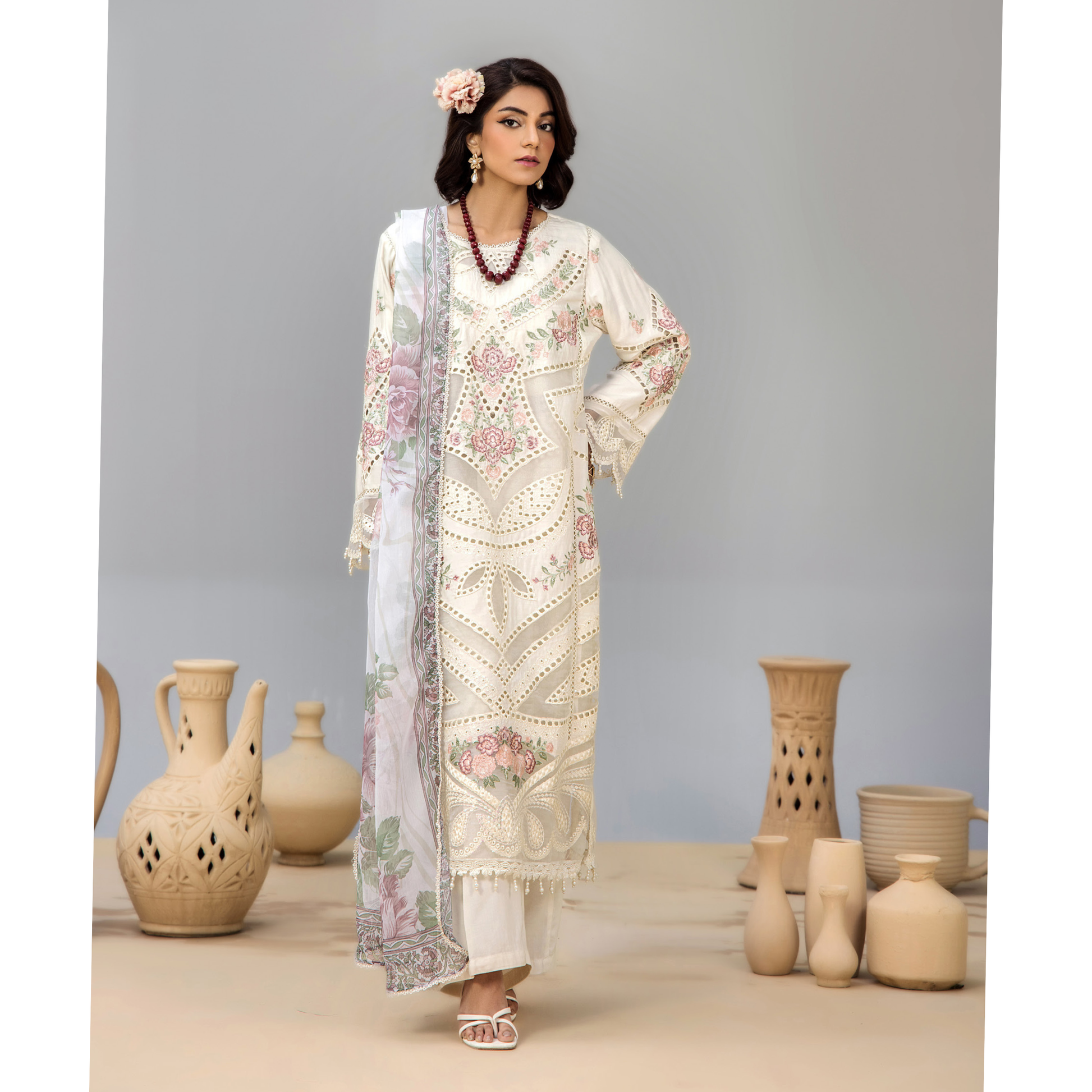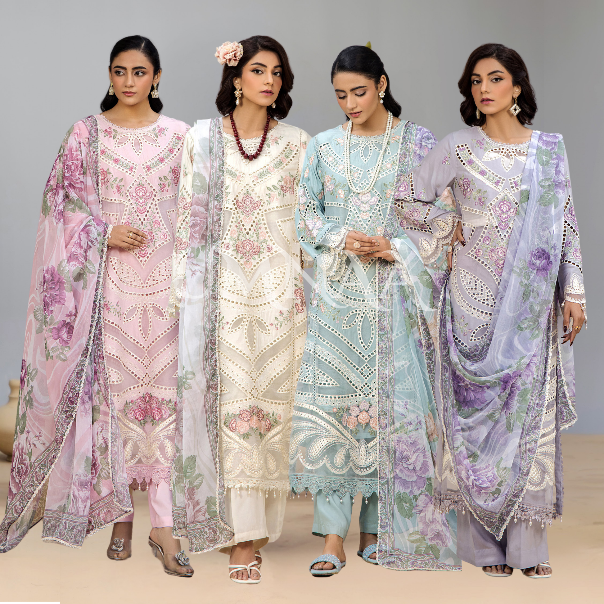 Introducing beautiful elegant Lawn dress featuring a soft Pastel base with intricate floral and geometric embroidery in shades of pink, green, and gold. The shirt has a straight cut with a delicate round neckline, detailed with lace trim, and long sleeves adorned with embroidery and lace at the cuffs. The hemline is finished with dainty tassels, adding a touch of charm. The Chiffon dupatta, with a floral print in pastel tones that complement the embroidery on the shirt. It has subtle borders that enhance its graceful appearance. The trousers are simple, straight-cut, and made from the same fabric, matching the overall color palette of the outfit making it perfect for festive occasions or semi-formal summer gatherings.