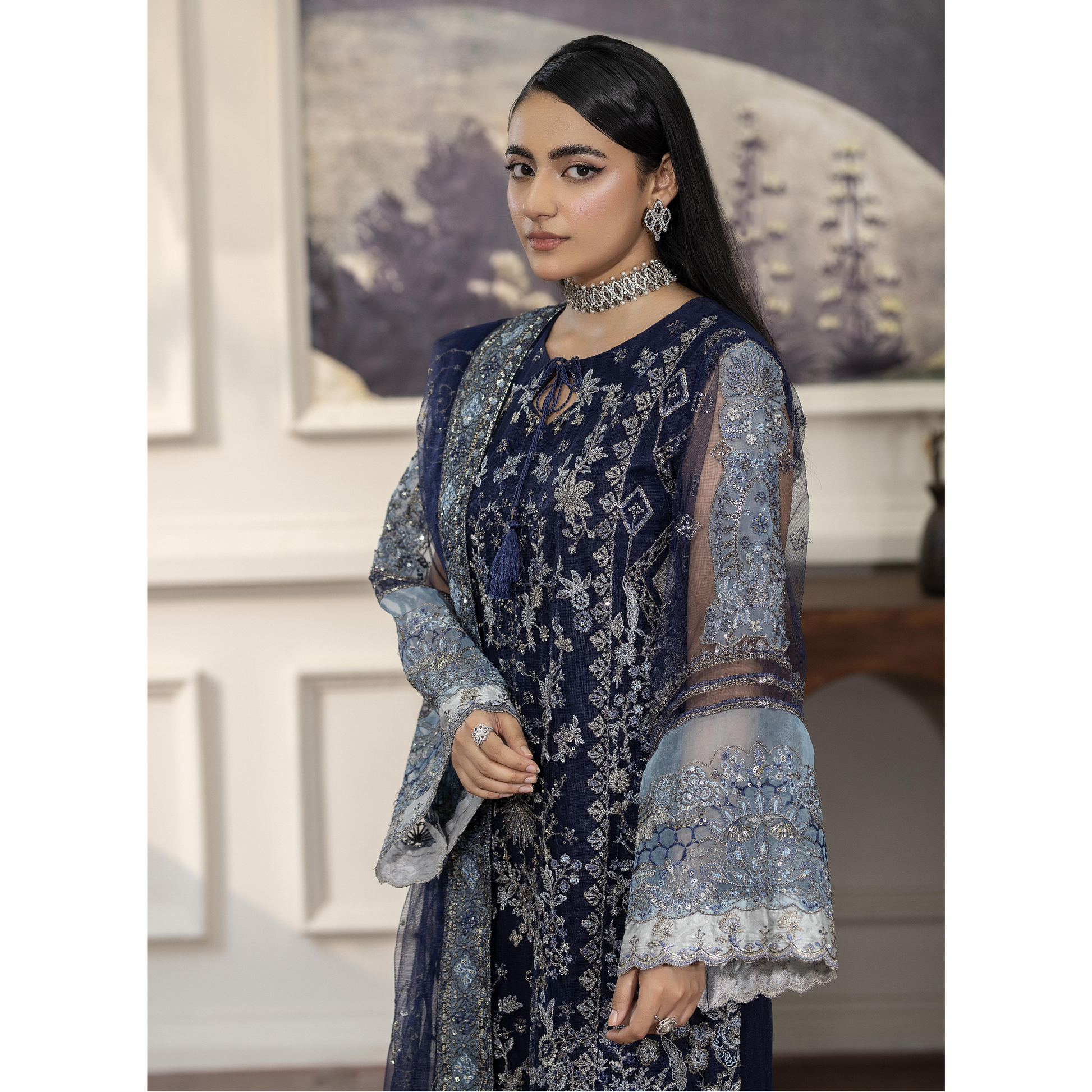 This elegant outfit features a beautifully embroidered and hand-embellished net shirt with intricate floral patterns and sparkling details. It’s paired with a matching embroidered net dupatta that adds a graceful, flowing touch. The look is completed with a rich, dyed cotton silk trouser, offering a perfect blend of traditional charm and modern sophistication.