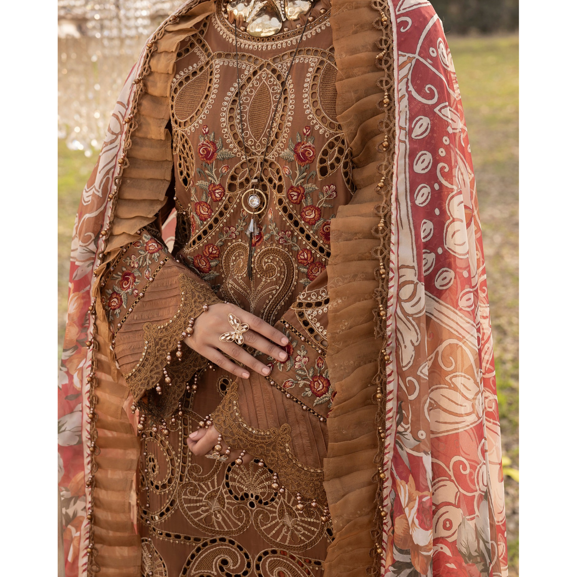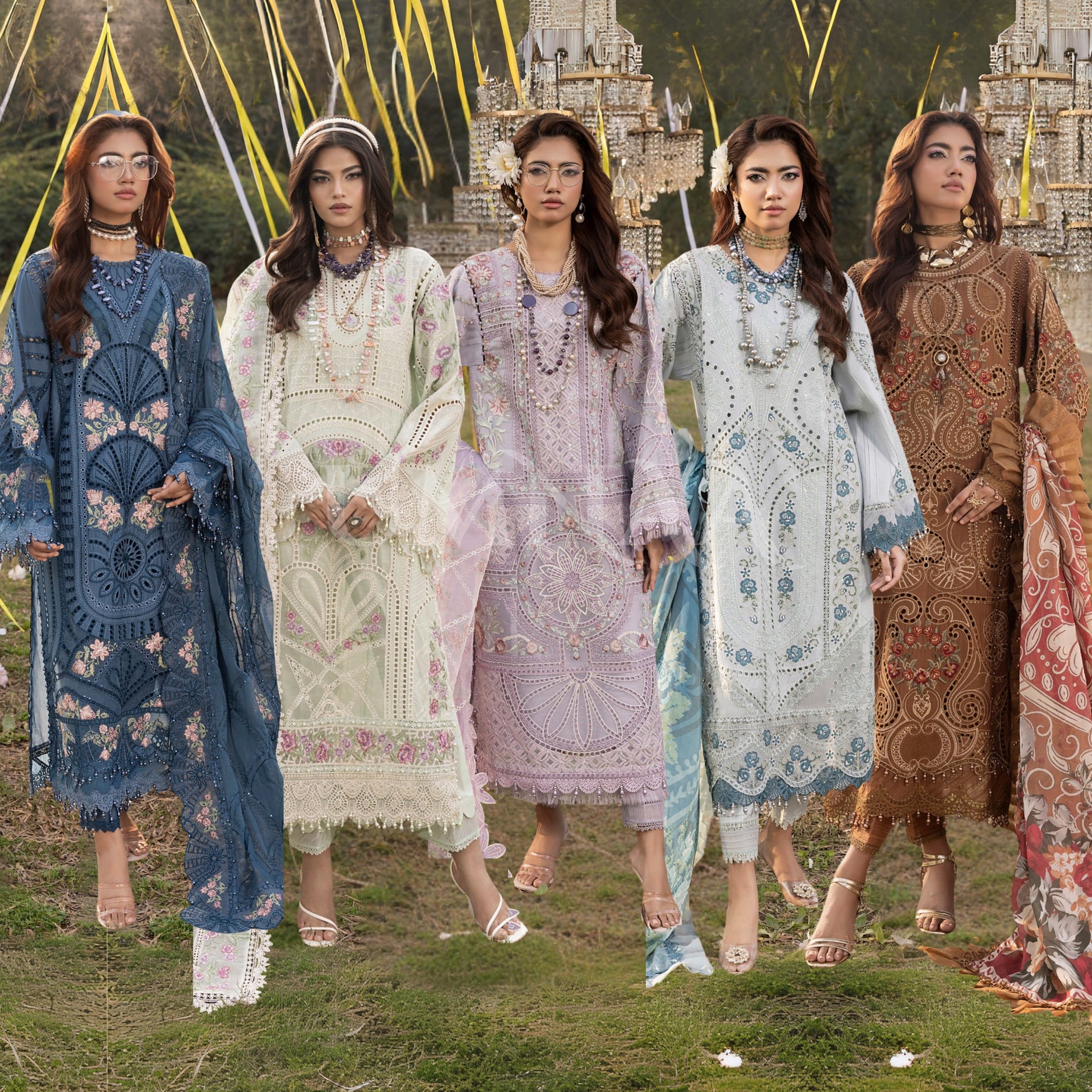 This stunning lawn collection is perfect for your festive and formal occasions. Each dress is beautifully designed with intricate embroidery and elegant detailing. The navy blue outfit features gorgeous floral patterns and rich cutwork, giving it a luxurious look. The off-white dress has soft pastel embroidery with delicate lace accents that add a graceful touch. If you love soft shades, the lavender dress is a dream, embellished with fine threadwork and pearl details. The powder blue dress is equally charming, with elegant floral motifs and a beautifully finished scalloped hem. And for a warm, traditional vibe, the rust brown outfit is a showstopper with bold embroidery and a vibrant printed dupatta. Every piece is crafted to make you stand out with style and sophistication.