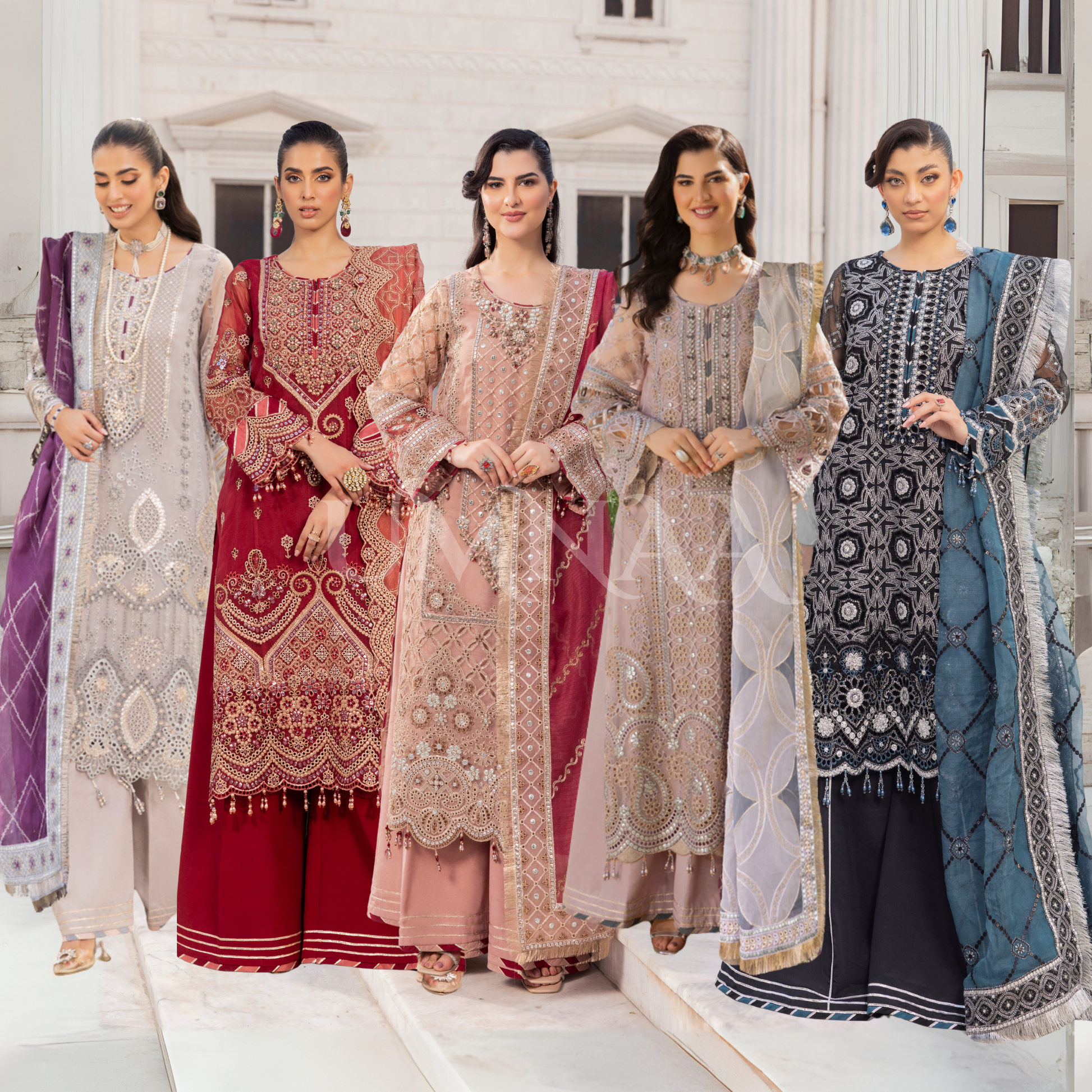 Enlighten your wardrobe "Jab We Met" Festive collection with the graceful designs . Introducing The embroidered Luxury dresses intricate threadwork with traditional motifs and modern elegance Embroidered & Hand Embellished Organza Shirt Front Dyed Organza Shirt Back and Dyed Raw Silk Trouser with Cotton Net Dupatta