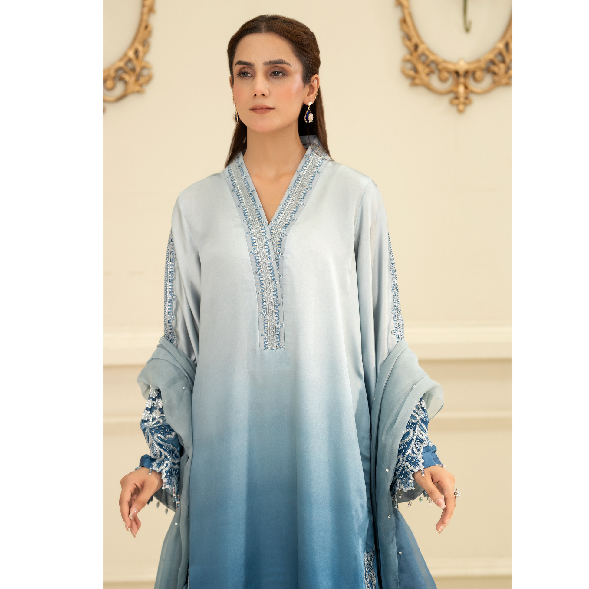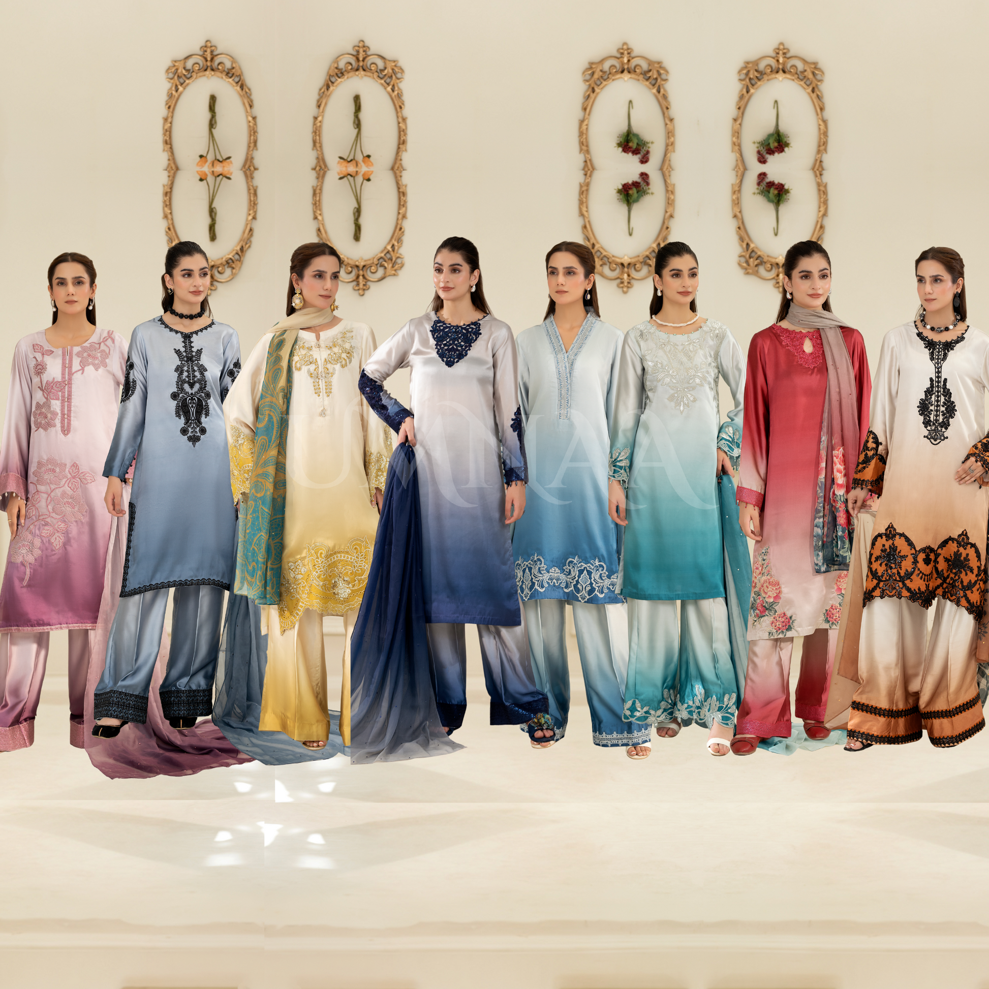 Introducing our Gradient Silk Collection – a graceful blend of elegance and modern charm. Each outfit is crafted in luxurious silk with soft gradient tones, paired beautifully with flowing plazo or farshi shalwars for a regal silhouette. The look is completed with a hand-embellished Stone Work dupatta, adding a delicate touch of sparkle and sophistication. Perfect for festive gatherings and formal events, this collection captures timeless beauty in every detail.