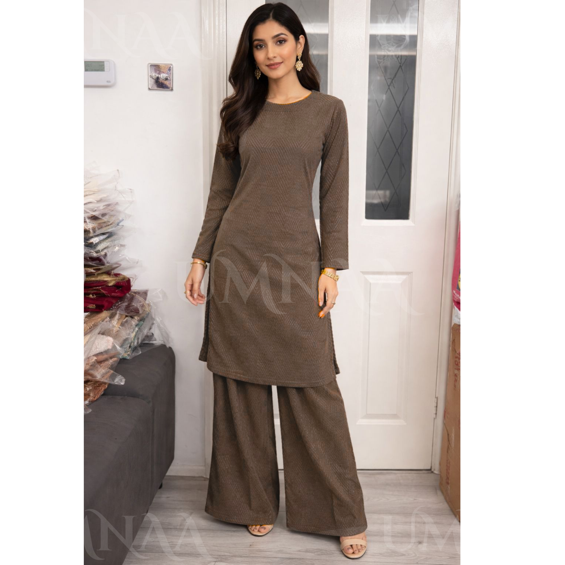 This elegant two-piece co-ord set is crafted from a premium English winter thick fabric, designed to keep you warm while maintaining a refined, structured look. The fabric features a subtle self-textured chevron pattern, adding depth and a luxurious feel without being overpowering.