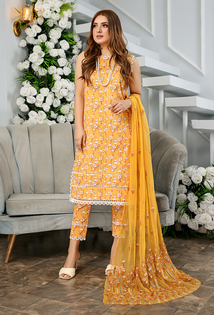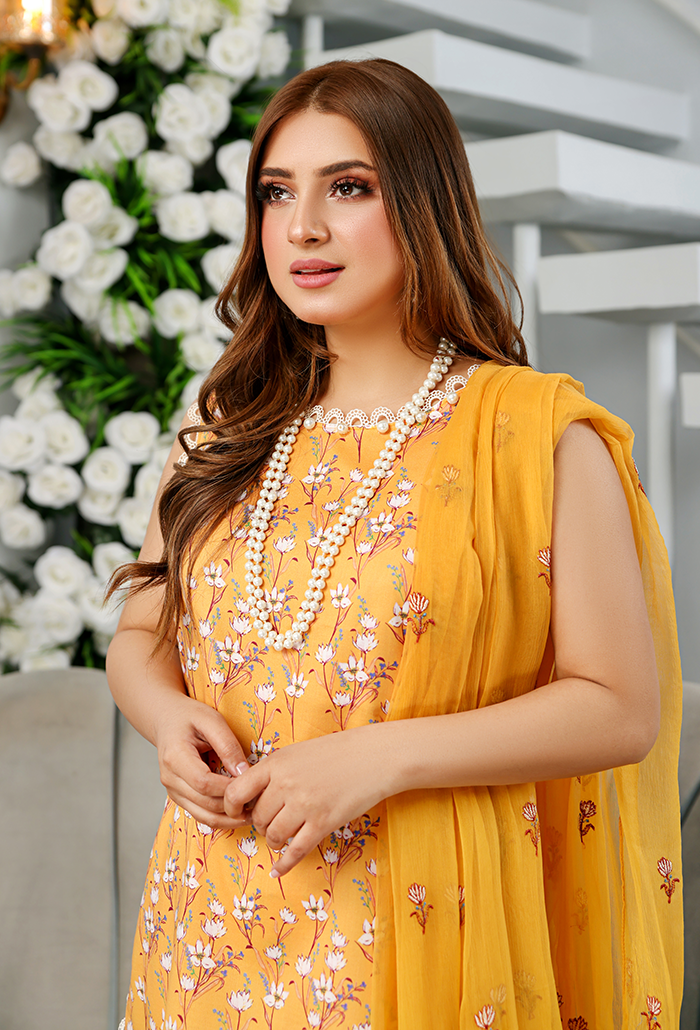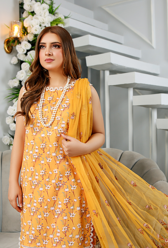 This set includes a printed lawn kameez paired with printed lawn trousers, complemented by an embroidered chiffon dupatta for an elegant finish.
